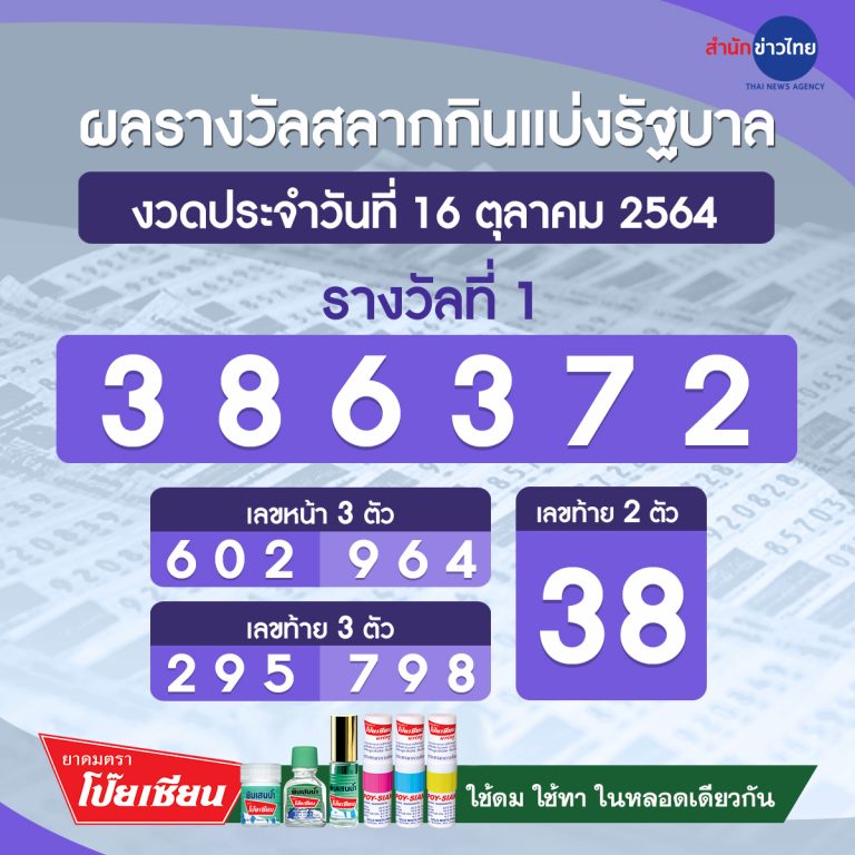 ผลรางวัลสลากกินแบ่งรัฐบาล งวดวันที่ 16 ตุลาคม 2564