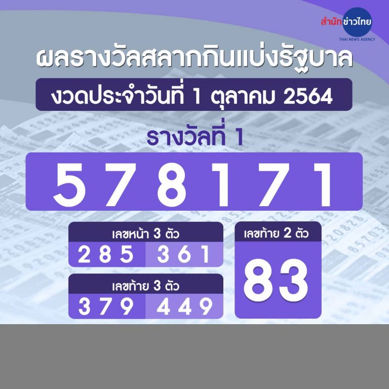 ผลรางวัลสลากกินแบ่งรัฐบาล งวดวันที่ 1 ตุลาคม 2564