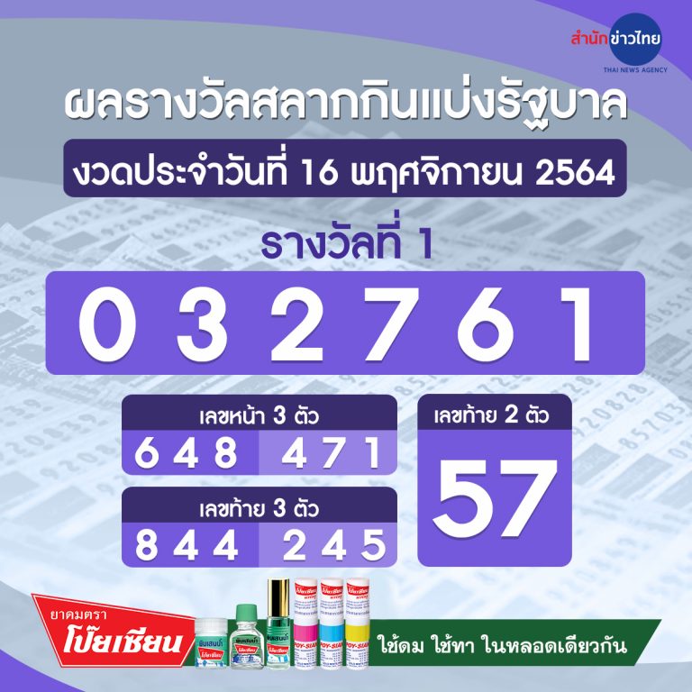ผลรางวัลสลากกินแบ่งรัฐบาล งวดวันที่ 16 พฤศจิกายน 2564