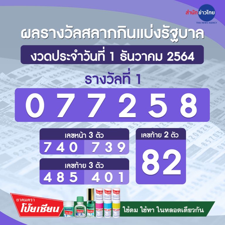 ผลรางวัลสลากกินแบ่งรัฐบาล งวดวันที่ 1 ธันวาคม 2564