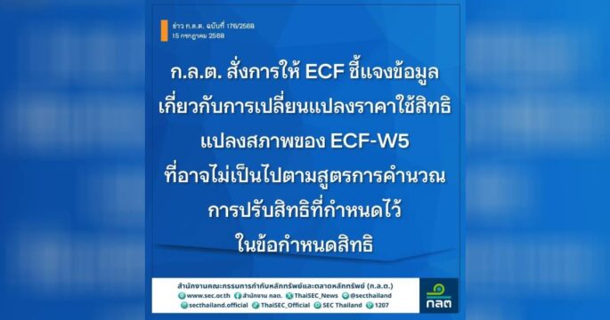 กรุงเทพฯ 15 ก.ค.-ก.ล.ต.สั่งการ ECF ชี้แจงกรณีเปลี่ยนแปลงราคาใช้สิทธิในการแปลงสภาพ ECF-W5 จากราคาใช้สิทธิที่คำนวณตามสูตรที่กำหนดในข้อกำหนดสิทธิของ ECF-W5 ที่ 0.55 บาทต่อหุ้น เป็น 5 บาทต่อหุ้น ที่อาจทำให้ผลประโยชน์ตอบแทนของผู้ถือ ECF-W5 ด้อยไปกว่าเดิมอย่างมีนัยสำคัญ ภายใน 18 ก.ค. 2568 สืบเนื่องจาก บริษัท อีสต์โคสท์เฟอร์นิเทค จำกัด (มหาชน) (ECF) ได้ชี้แจงข้อมูลผ่านระบบเผยแพร่ข้อมูลบริษัทจดทะเบียนของตลาดหลักทรัพย์แห่งประเทศไทย (ระบบ SETLink) เกี่ยวกับการปรับสิทธิ ใบสำคัญแสดงสิทธิที่จะซื้อหุ้นสามัญของบริษัท อีสต์โคสท์เฟอร์นิเทค จำกัด (มหาชน) หรือ ECF-W5 จากการเปลี่ยนแปลงมูลค่าที่ตราไว้ (par) ของหุ้น ECF โดยการรวมหุ้น (โดยการรวม par จาก 0.25 บาทต่อหุ้น เป็น 5 บาทต่อหุ้น) รวมทั้งการเสนอขายหุ้นสามัญให้แก่ผู้ถือหุ้นเดิมตามสัดส่วนการถือหุ้น (right offering) และการจัดสรรหุ้นสามัญเพิ่มทุนเพื่อรองรับการใช้สิทธิตามใบสำคัญแสดงสิทธิที่จะซื้อหุ้นสามัญครั้งที่ 6 […]