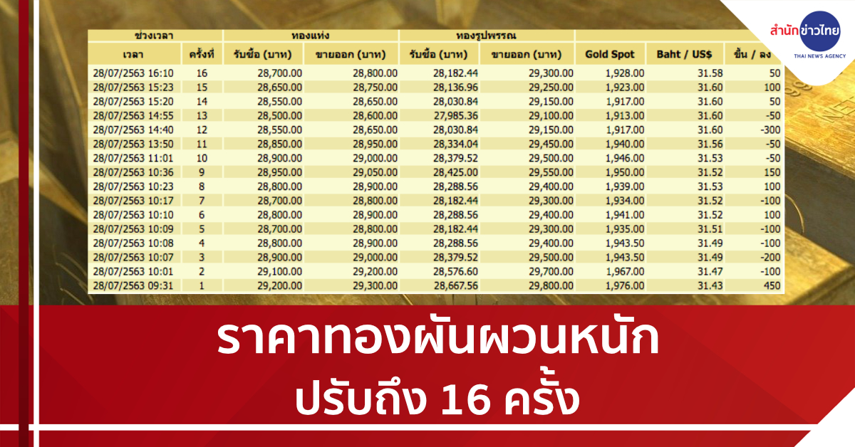 กทม. 28 ก.ค.-ทองคำราคาผันผวนหนัก ปรับขึ้นลงถึง 16 ครั้ง โดยเวลา16.10 น. ซึ่งปรับราคาครั้งสุดท้าย ทองคำแท่ง ขายออกบาทละ 28,800 บาท ทองรูปพรรณ 96.5% ขายออกบาทละ 29,300 บาท