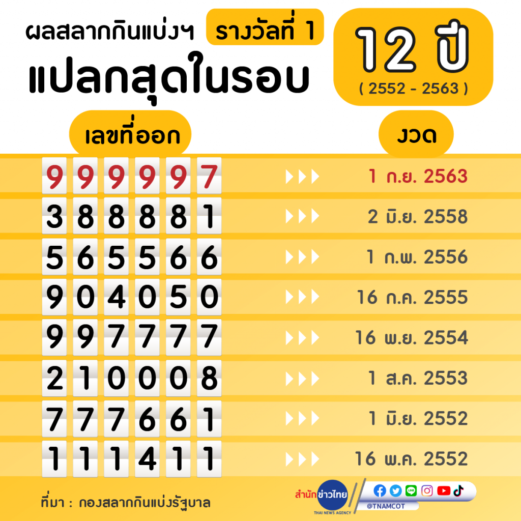 สำนักข่าวไทย 2 ก.ย.- ผลสลากกินแบ่งรัฐบาล เลขที่ออก 999997 เรียกได้ว่าฮือฮาสุดๆ กับผลสลากกินแบ่งรัฐบาล งวดประจำวันที่ 1 กันยายน 2563 เรามาย้อนดูกัน ว่า เคยมีรางวัลเลขแปลกๆแบบนี้ที่ทำให้ผู้คนต่างฮือฮาและเป็นที่พูดถึงอีกหรือไม่