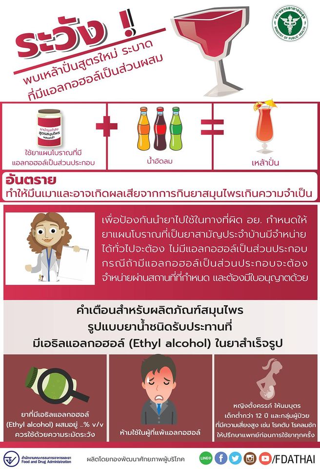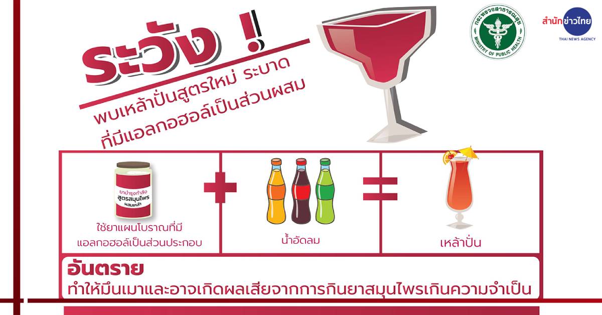 สำนักงานคณะกรรมการอาหารและยา (อย.) เตือนการแพร่ระบาดของเครื่องดื่มแอลกอฮอล์ชนิดใหม่ ซึ่งได้นำยาแผนโบราณที่มีแอลกอฮอล์เป็นส่วนประกอบ ผสมกับน้ำอัดลม ขายตามร้านน้ำปั่น รถเข็นน้ำปั่นทั่วไป รู้หรือไม่เสี่ยงอาจเกิดอันตรายได้