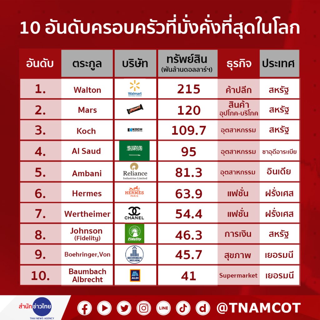 สำนักข่าว Bloomberg จัดอันดับครอบครัวที่มั่งคั่งที่สุดในโลกปีนี้ โดยยกให้ตระกูล Waltons เจ้าของผู้ก่อตั้งห้าง Walmart ครองอันดับ 1 ด้วยมูลค่าทรัพย์สินถึง 215,000 ล้านดอลลาร์สหรัฐ โดยมีทรัพย์สินเพิ่มขึ้นจากปีที่แล้ว 25,000 ล้านดอลลาร์สหรัฐ หรือคิดเป็นมูลค่าเพิ่มขึ้นเกือบ 3 ล้านดอลลาร์สหรัฐ/ชั่วโมง
