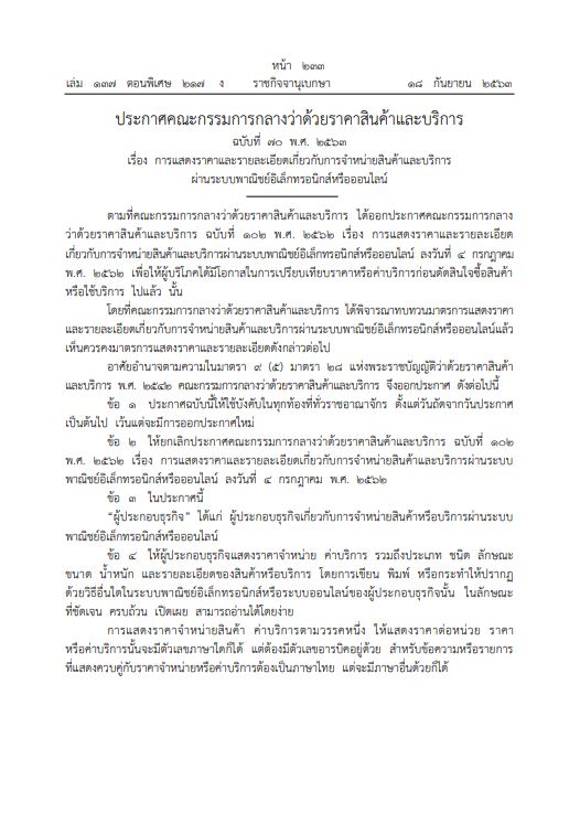 วันนี้ (22 ก.ย.) เว็บไซต์ราชกิจจานุเบกษา เผยแพร่ประกาศ คณะกรรมการกลางว่าด้วยราคาสินค้าและบริการ ฉบับที่ 70 พ.ศ. 2563 เรื่องการแสดงราคาและรายละเอียดเกี่ยวกับการจำหน่ายสินค้าและบริการผ่านระบบพาณิชย์อิเล็กทรอนิกส์หรือออนไลน์ หากผู้ค้าไม่ทำการแจ้งราคาในโพสต์ และให้สอบถามราคาผ่าน Inbox มีโทษปรับ 10,000 บาท ใจความระบุว่า