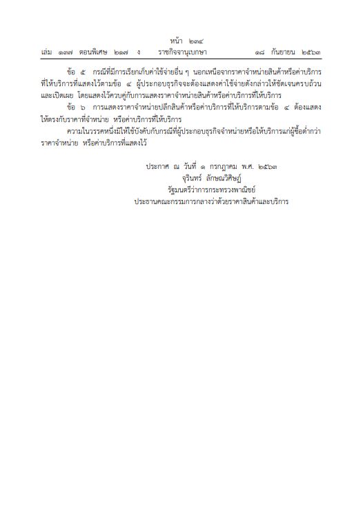 ทั้งนี้ กรณีที่มีการเรียกเก็บค่าใช้จ่ายอื่นๆ นอกเหนือจากราคาจำหน่ายสินค้า หรือค่าบริการที่ให้บริการที่แสดงไว้ตามข้อ 4 ผู้ประกอบธุรกิจจะต้องแสดงค่าใช้จ่ายดังกล่าวให้ชัดเจนครบถ้วน และเปิดเผย โดยแสดงไว้ควบคู่กับการแสดงราคาจำหน่ายสินค้า หรือค่าบริการที่ให้บริการ ข้อ 6 การแสดงราคาจำหน่ายปลีกสินค้าหรือค่าบริการที่ให้บริการตามข้อ 4 ต้องแสดง ให้ตรงกับราคาที่จำหน่าย หรือค่าบริการที่ให้บริการ ความในวรรคหนึ่งมิให้ใช้บังคับกับกรณีที่ผู้ประกอบธุรกิจจำหน่าย หรือให้บริการแก่ผู้ซื้อต่ำกว่าราคาจำหน่าย หรือค่าบริการที่แสดงไว้