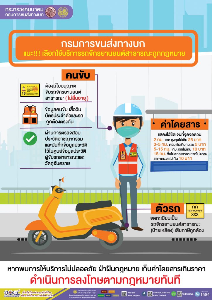 กรมการขนส่งทางบก ขอความร่วมมือประชาชนที่ใช้บริการรถจักรยานยนต์สาธารณะ ให้เลือกใช้บริการรถจักรยานยนต์สาธารณะที่ถูกต้องตามกฎหมาย เพื่อความปลอดภัยในการใช้บริการ และได้รับการคุ้มครองสิทธิประโยชน์ตามกฎหมาย โดย