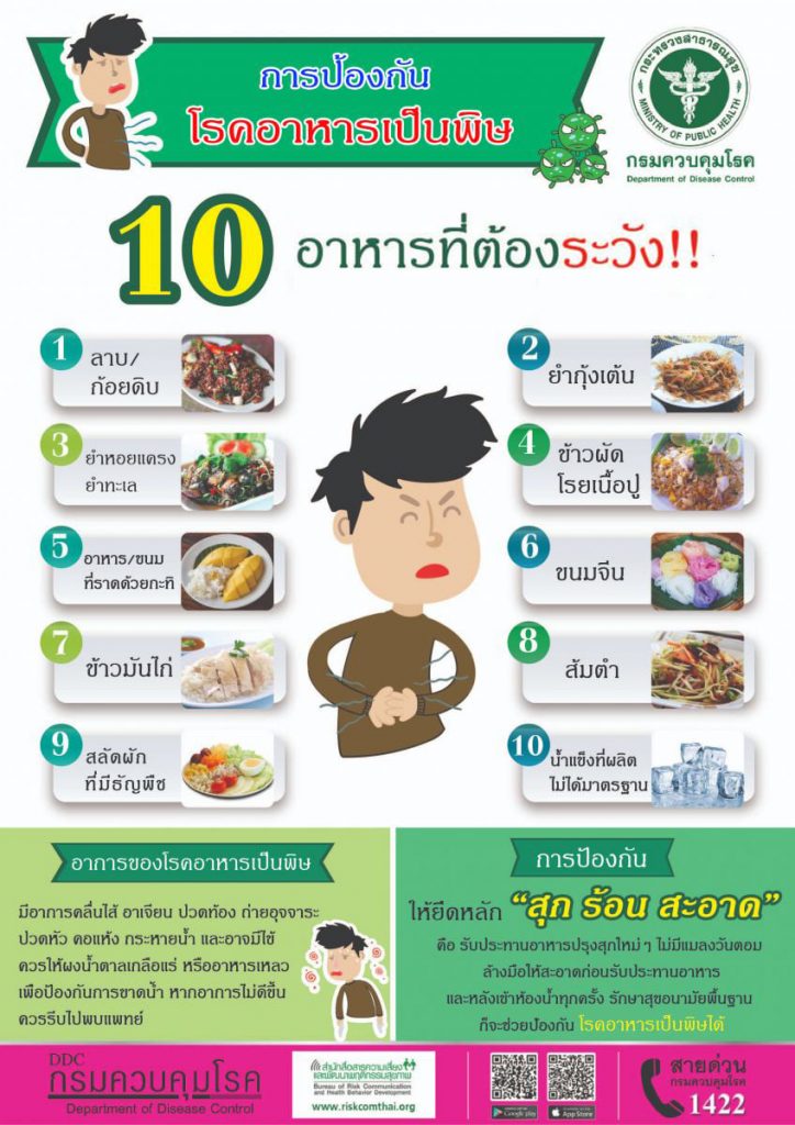 ไม่สะอาด อาหารที่ปรุงเสร็จแล้วเก็บไว้นานเกิน 2 ชม. โดยไม่นำไปแช่เย็นหรือนำมาอุ่นร้อนให้ทั่วถึงก่อนรับประทาน ประกอบกับสภาพอากาศ ซึ่งอากาศร้อนทำให้เชื้อแบคทีเรียเจริญเติบโตได้ดี สำหรับอาหารที่มีความเสี่ยงต่อการเกิดโรคอาหารเป็นพิษที่ประชาชนควรระมัดระวัง 10 เมนูเสี่ยง ได้แก่ 1.จ่อม ลาบหรือก้อยดิบ 2.อาหารประเภทยำ เช่น ยำกุ้งเต้น 3.อาหารทะเล เช่น ยำทะเล 4.ข้าวผัด/ข้าวผัดโรยเนื้อปู 5.อาหารหรือขนมที่มีส่วนประกอบของกะทิสด 6.ขนมจีน 7.ข้าวมันไก่ 8.ส้มตำ 9.สลัดผัก และ 10.น้ำแข็งที่ไม่สะอาด นอกจากนี้ การจัดเตรียมอาหารเลี้ยงคนหมู่มาก เช่น อาหารกล่อง ควรเลือกเป็นอาหารแห้ง ไม่ราดกับข้าวลงบนข้าวโดยตรง ควรรับประทานภายใน 2 ชั่วโมงหลังจากปรุงเสร็จ และหากมีสี กลิ่น รส ผิดปกติไม่ควรรับประทานโดยเด็ดขาด