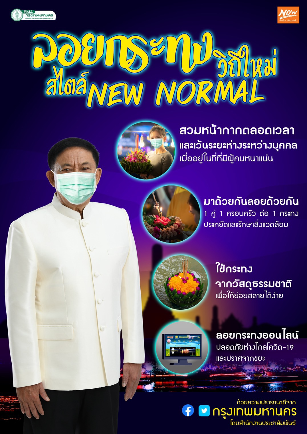 กรุงเทพมหานครได้กำหนดจัดงานเทศกาลลอยกระทง ประจำปี 2563 ภายใต้แนวคิด “ลอยกระทงวิถีใหม่ สไตล์ New Normal” โดยจัดพื้นที่ให้ประชาชนได้เข้าร่วมลอยกระทงแบบปลอดภัย มีการเว้นระยะห่างในการลอยกระทง และเพื่ออนุรักษ์และสืบสานประเพณีไทย สืบทอดวิถีชีวิตของชุมชนที่มีต่อสายน้ำ