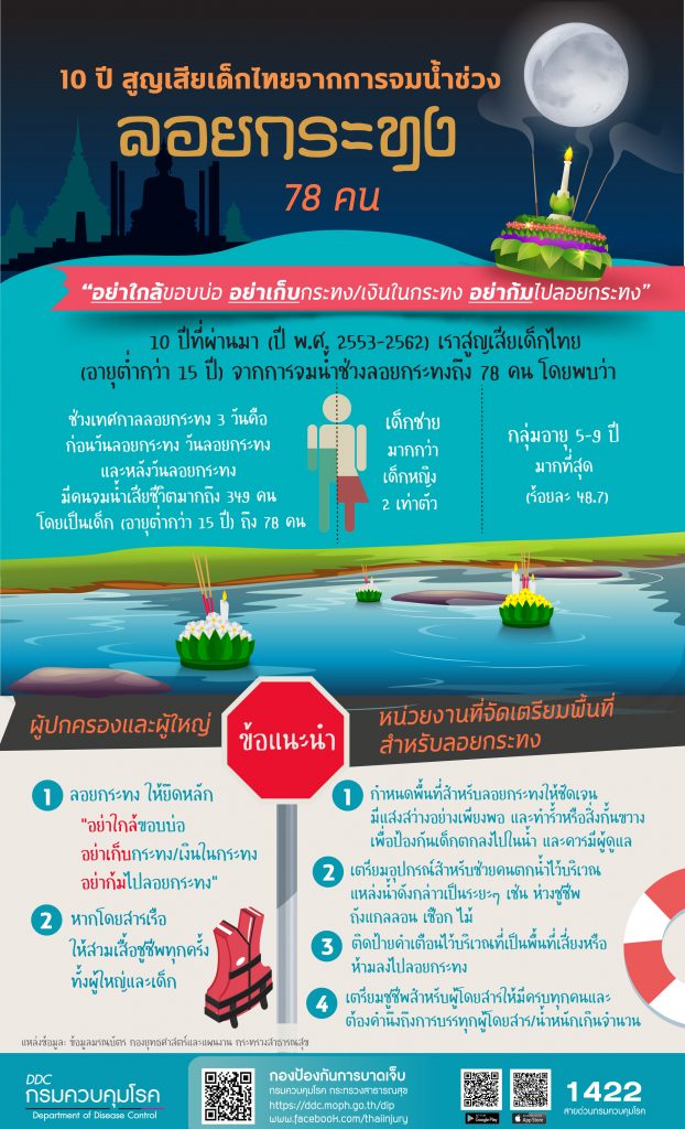 แล้วรู้หรือไม่ 10 ปีที่ผ่านมา ประเทศไทยสูญเสียเด็ก (อายุต่ำกว่า 15 ปี) จากการจมน้ำในช่วงลอยกระทง จำนวนทั้งหมด 78 คน โดยพบว่า ช่วงเทศกาลลอยกระทง 3 วัน คือวันก่อนลอยกระทง วันลอยกระทง และหลังวันลอยกระทง มีคนจมน้ำเสียชีวิตมากถึง 349 คน โดยเป็นเด็ก (อายุต่ำกว่า 15 ปี) ถึง 78 คน เป็นเด็กชายมากกว่าเด็กหญิง 2 เท่าตัว กลุ่มอายุ 5-9 ปี มากที่สุด (ร้อยละ 48.7)