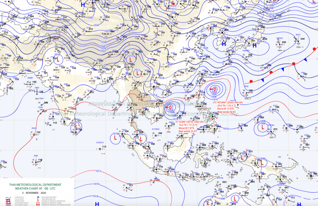 เมื่อเวลา 16.00 น. ของวันที่ 5 พฤศจิกายน 2563 พายุโซนร้อน “โคนี” บริเวณทะเลจีนใต้ตอนกลางมีศูนย์กลางอยู่ห่างประมาณ 170 กิโลเมตร ทางด้านตะวันออกของเมืองกวีนอน ประเทศเวียดนาม หรือที่ละติจูด 14.2 องศาเหนือ ลองจิจูด 110.8 องศาตะวันออก มีความเร็วลมสูงสุดใกล้ศูนย์กลางประมาณ 65 กิโลเมตรต่อชั่วโมง กำลังเคลื่อนตัวทางทิศตะวันตกอย่างช้าๆ คาดว่าจะอ่อนกำลังลงเป็นพายุดีเปรสชัน ก่อนเคลื่อนขึ้นฝั่งเมืองกวีนอน ประเทศเวียดนามในเช้าวันที่ 6 พฤศจิกายน 2563 หลังจากนั้นจะอ่อนกำลังลงเป็นหย่อมความกดอากาศต่ำบริเวณประเทศกัมพูชา ส่งผลให้
