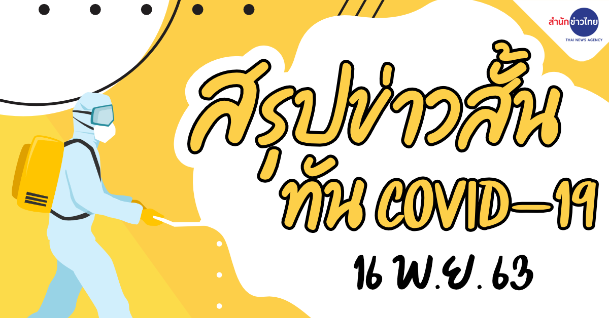 สำนักข่าวไทย 16 พ.ย. 63 – สถานการณ์การติดเชื้อ COVID-19 ประเทศไทย มีผู้ป่วยรายใหม่ 1 ราย ผู้ป่วยยืนยันสะสม 3,875 ราย หายป่วยแล้ว 3,721 ราย เสียชีวิตสะสม 60 ราย