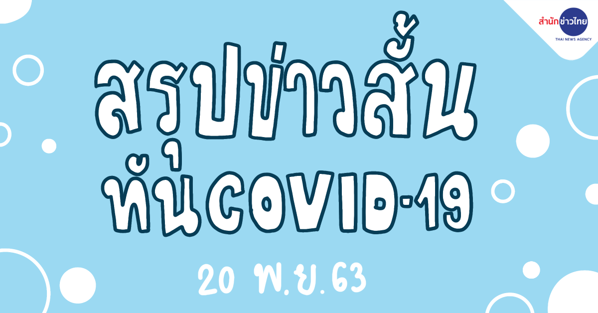 สำนักข่าวไทย 20 พ.ย. 63 – สถานการณ์การติดเชื้อ COVID-19 ประเทศไทย พบผู้ป่วยรายใหม่ 4 ราย ผู้ป่วยยืนยันสะสม 3,892 ราย หายป่วยแล้ว 3,745 ราย เสียชีวิตสะสม 60 ราย