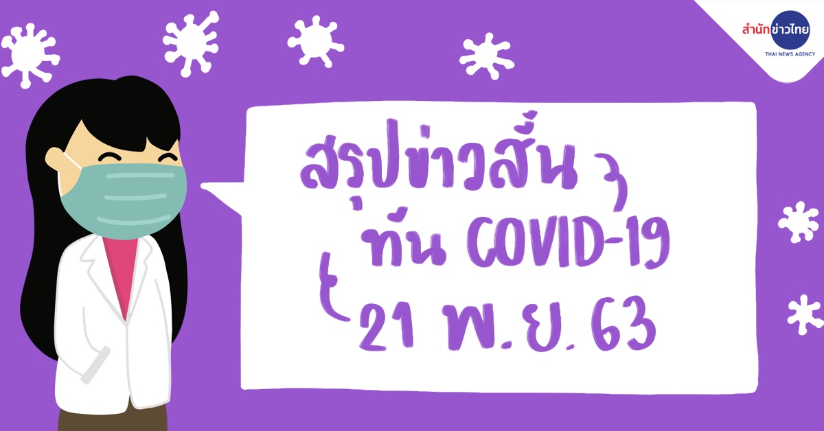 สำนักข่าวไทย 21 พ.ย. 63 – สถานการณ์การติดเชื้อ COVID-19 ประเทศไทยพบผู้ป่วยรายใหม่ 10 ราย ผู้ป่วยยืนยันสะสม 3,902 ราย หายป่วยแล้ว 3,756 ราย เสียชีวิตสะสม 60 ราย