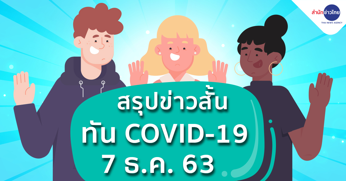สำนักข่าวไทย 7 ธ.ค. 63 – สถานการณ์การติดเชื้อ COVID-19 ประเทศไทย มีผู้ป่วยรายใหม่ 21 ราย ผู้ป่วยยืนยันสะสม 4,107 ราย หายป่วยแล้ว 3,868 ราย เสียชีวิตสะสม 60 ราย