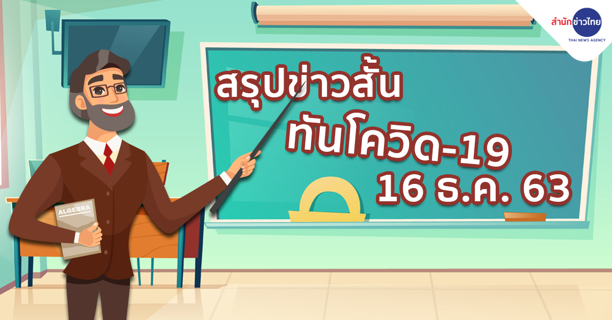 สำนักข่าวไทย 16 ธ.ค. 63 – สถานการณ์การติดเชื้อ COVID-19 ประเทศไทย มีผู้ป่วยรายใหม่ 15 ราย ผู้ป่วยยืนยันสะสม 4,161 ราย หายป่วยแล้ว 3,977 ราย เสียชีวิตสะสม 60 ราย