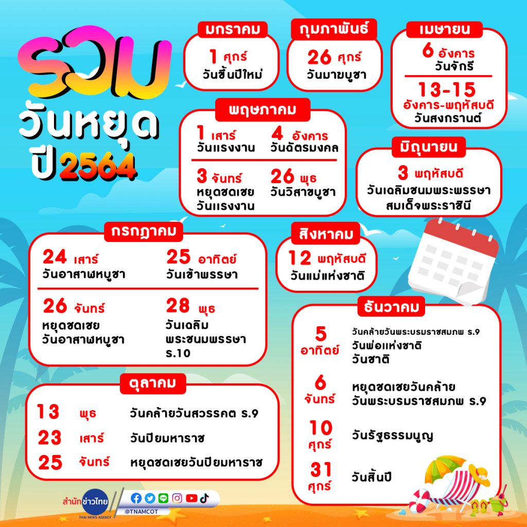 สำนักข่าวไทย 28 ธ.ค. – อีกไม่กี่วันวัน เราก็จะก้าวเข้าสู่ “ปี 2564” อย่างเป็นทางการ ใครหลายคนอาจจะกำลังเตรียมตัววางแผนพักผ่อนประจำปี หรือวางแผนไปเที่ยวกับครอบครัวกัน สำนักข่าวไทยจึงขอรวบรวมวันหยุด วันสำคัญในปี 2564 มาฝากทุกคนกันค่ะ