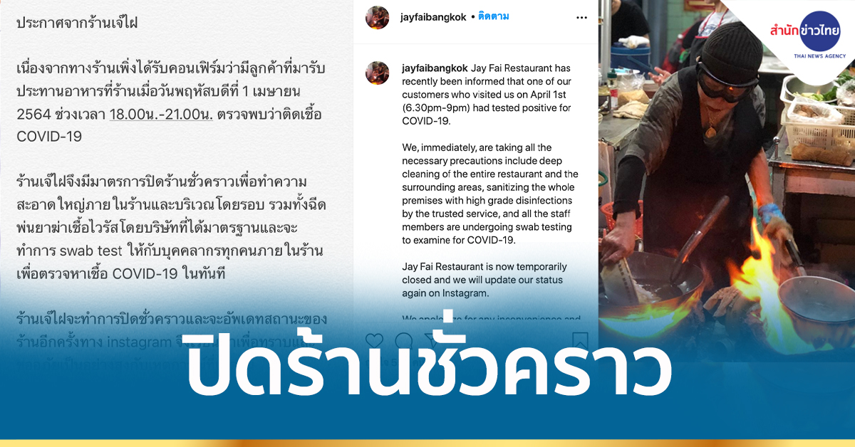“เจ๊ไฝ” โพสต์ประกาศผ่านอินสตาแกรม jayfaibangkok แจ้งปิดร้านชั่วคราว หลังพบลูกค้าที่มารับประทานอาหารที่ร้าน เมื่อวันที่ 1 เมษายนที่ผ่านมา ช่วงเวลา 18.00 – 21.00 น. ตรวจพบติดเชื้อโควิด-19
