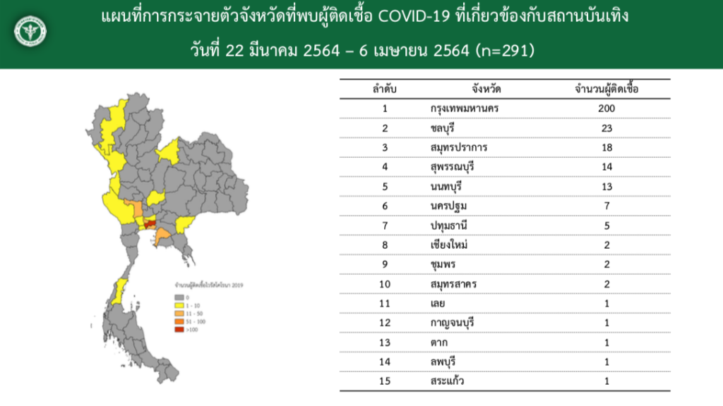 7 เม.ย.-แผนที่การกระจายตัวจังหวัดที่พบผู้ติดเชื้อ COVID-19 ที่เกี่ยวข้องกับสถานบันเทิง วันที่ 22 มีนาคม – 6 เมษายน 2564 (n=291)