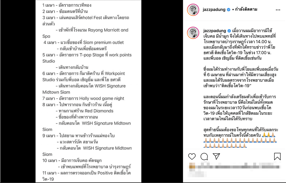“แจ๊ส ชวนชื่น” โพสต์อินสตาแกรม “jazzpadung” แจ้งผลตรวจติดโควิด-19 พร้อมแจงไทม์ไลน์ 10 วัน มีเล่นคอนเสิร์ตที่จะงหวัดระยอง เดินทางโดยรถยนต์ส่วนตัว และไปอัดรายการร่วมกับ “บอล เชิญยิ้ม – โย ยศวดี” ที่แจ้งผลตรวจติดเชื้อไปก่อนหน้านี้ รวมถึงไปกินข้าวที่สยาม