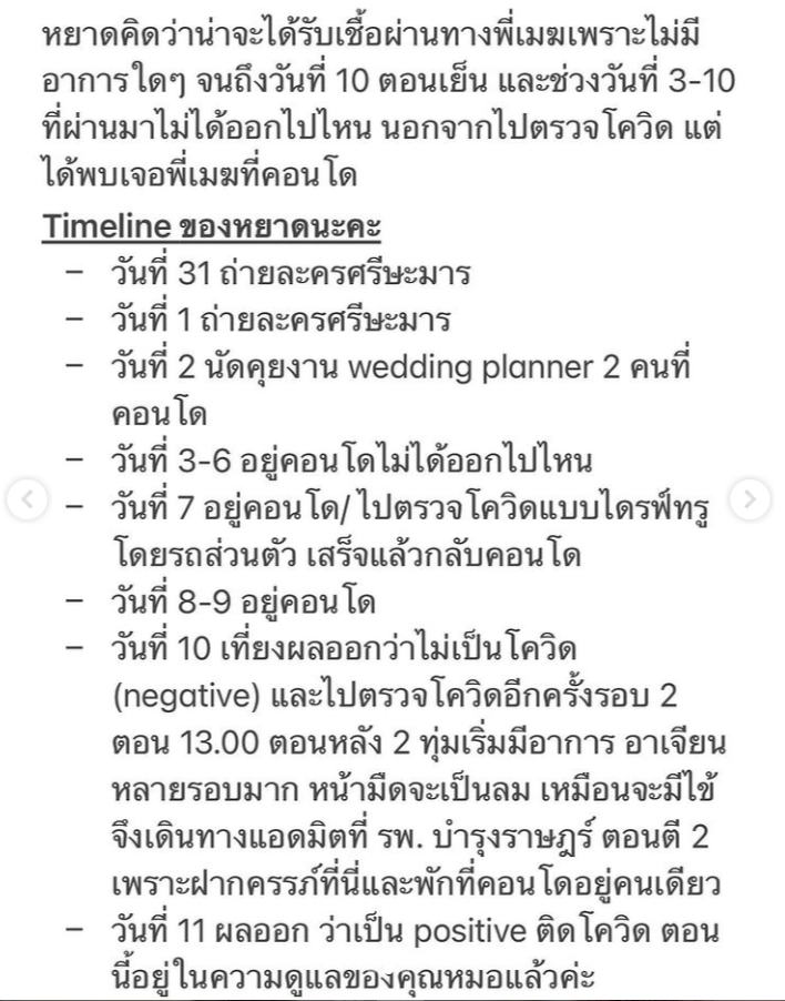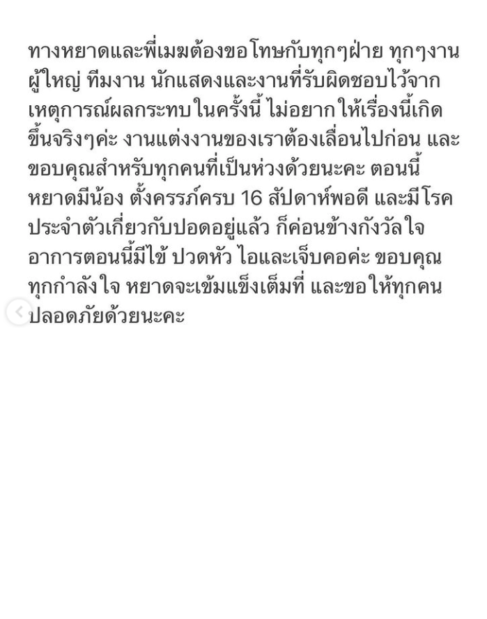 ‘หยาดทิพย์ ราชปาล’ ดาราสาวโพสต์อินสตาแกรม ประกาศเลื่อนงานแต่ง! พร้อมแจ้งว่าตนเองและแฟนหนุ่ม ติดโควิด-19 เข้ารับการรักษาแล้ว แจ้งไทม์ไลน์ส่วนใหญ่ไปถ่ายละครและอยู่ที่พัก ทั้งนี้สาวหยาด แสดงความกังวลใจ เนื่องจากตั้งครรภ์ได้ 16 สัปดาห์ และยังมีอาการทางปอดอีกด้วย