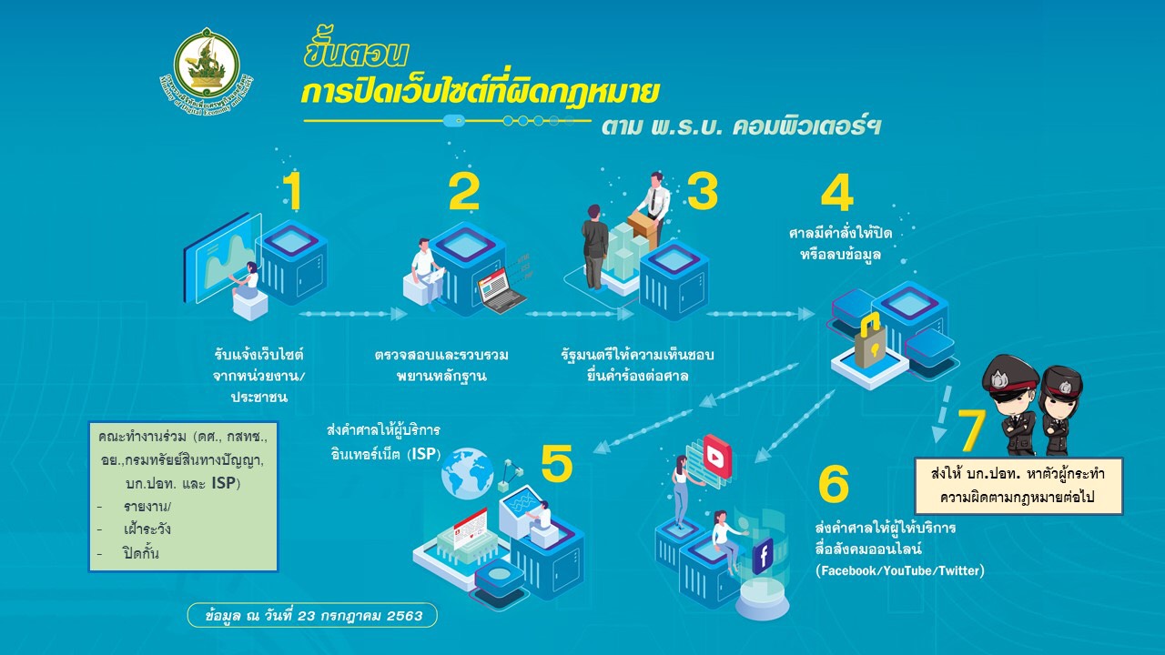 ที่ผ่านมาดีอีเอสได้ขอความร่วมมือไปยังแพลตฟอร์มต่างประเทศ โดยยูทูปได้ดำเนินการตามที่ขอไปประมาณร้อยละ 90 แต่เฟซบุ๊คดำเนินการเพียงร้อยละ 28 จึงต้องสื่อสารให้เคารพและรับผิดชอบต่อสังคมไทยด้วย ขณะเดียวกันยังได้ตั้งคณะทำงาน ร่วมกับทาง ISP หรือ ผู้ให้บริการอินเทอร์เน็ต เพื่อควบคุมเรื่องที่ผิดกฎหมายด้วย โดยในรอบ 7 เดือนแรกของปี 2563 ได้ยื่นคำร้องต่อศาล เพื่อสั่งให้ปิดหรือลบข้อมูลในเว็บไซต์ผิดกฎหมาย 7,164 ยูอาร์แอล (ข้อมูล ณ วันที่ 23 ก.ค.63) จากที่ได้รับแจ้งทั้งสิ้น 8,715 ยูอาร์แอล และดำเนินคดีกับผู้กระทำผิดกฎหมายด้วย