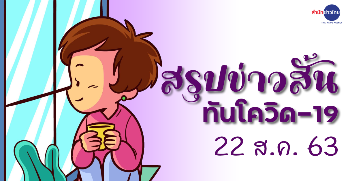 สำนักข่าวไทย 22 ส.ค. 63 – สถานการณ์การติดเชื้อ COVID-19 ในประเทศไทย ไม่พบผู้ป่วยรายใหม่ ผู้ป่วยยืนยันสะสม 3,390 ราย หายป่วยแล้ว 3,220 ราย เสียชีวิตสะสม 58 ราย