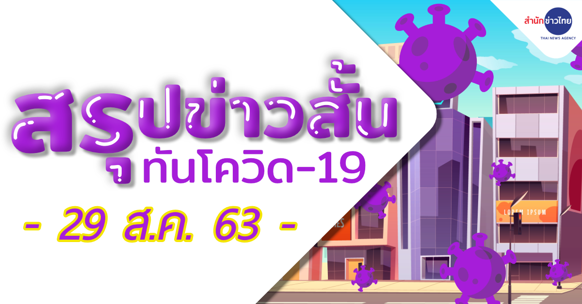 สำนักข่าวไทย 29 ส.ค. 63 – สถานการณ์การติดเชื้อ COVID-19 ประเทศไทย พบผู้ป่วยรายใหม่ 1 ราย มาจากเนเธอร์แลนด์ ผู้ป่วยยืนยันสะสม 3,411 ราย หายป่วยแล้ว 3,242 ราย เสียชีวิตสะสม 58 ราย