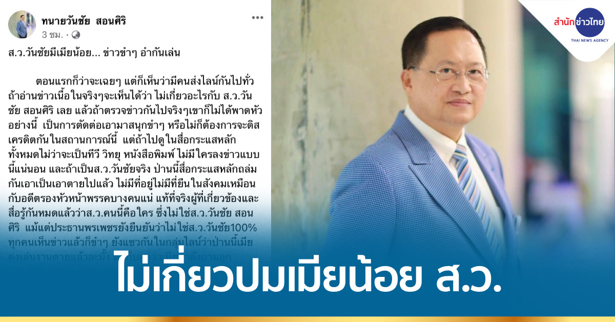 นายวันชัย สอนศิริ สมาชิกวุฒิสภา โพสต์ข้อความผ่าน เฟซบุ๊ก ทนายวันชัย สอนศิริ หัวข้อ ส.ว.วันชัยมีเมียน้อย… ข่าวขำๆ อำกันเล่น พร้อมระบุว่าตอนแรกก็ว่าจะเฉย ๆ แต่ก็เห็นว่ามีคนส่งไลน์กันไปทั่ว ถ้าอ่านข่าวเนื้อในจริงๆ จะเห็นได้ว่าไม่เกี่ยวอะไรกับ ส.ว.วันชัย สอนศิริ เลย ถ้าตรวจข่าวกันไปจริงๆ เขาก็ไม่ได้พาดหัวอย่างนี้ เป็นการตัดต่อเอามาสนุกขำๆ หรือไม่ก็ต้องการจะดิสเครดิตกันในสถานการณ์นี้ แต่ถ้าไปดูในสื่อกระแสหลักทั้งหมดไม่ว่าจะเป็นทีวี วิทยุ หนังสือพิมพ์ ไม่มีใครลงข่าวแบบนี้แน่นอน