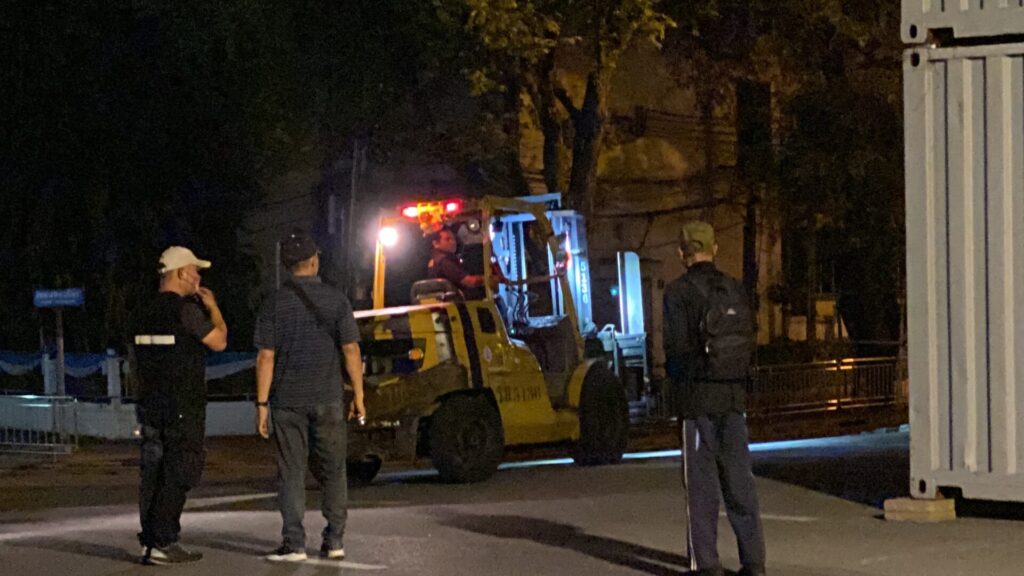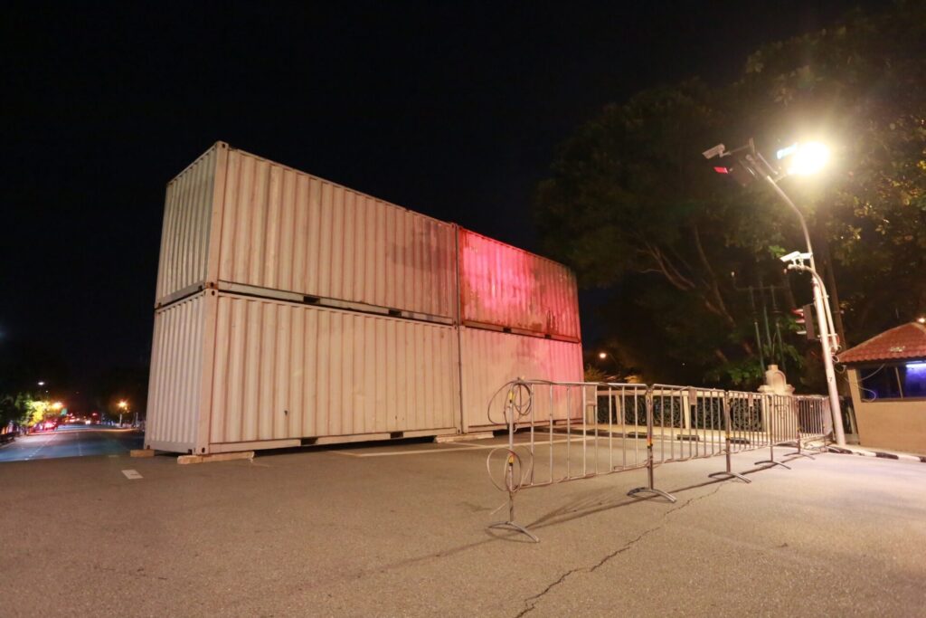 กรุงเทพฯ 23 ส.ค. – เจ้าหน้าที่นำตู้คอนเทนเนอร์วางกั้นบริเวณใกล้ทำเนียบรัฐบาล หลังวันนี้จะมีกลุ่มมวลชนนัดจัดกิจกรรมทางการเมืองหลายจุด ขับไล่นายกฯ และวิจารณ์การทำงานของรัฐบาล