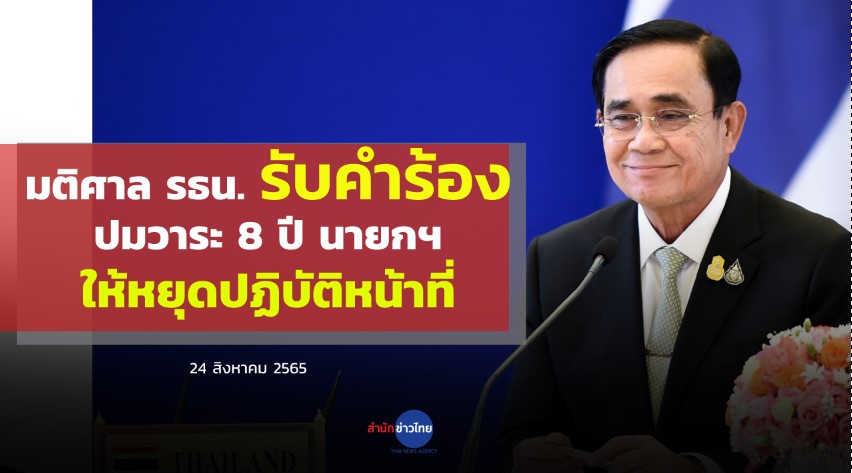 สำนักงานศาลรัฐธรรมนูญ 24 ส.ค.- ศาลรัฐธรรมนูญมีมติเอกฉันท์ รับคำร้องเรื่องการดำรงตำแหน่ง 8 ปี ของนายกรัฐมนตรี ไว้พิจารณา ขณะเดียวกัน มีมติ 5 : 4 เสียง ให้ พล.อ.ประยุทธ์ หยุดปฏิบัติหน้าที่ตั้งแต่วันนี้ คาดจะเร่งพิจารณาคำร้องดังกล่าวให้เสร็จภายในเดือน ก.ย.นี้