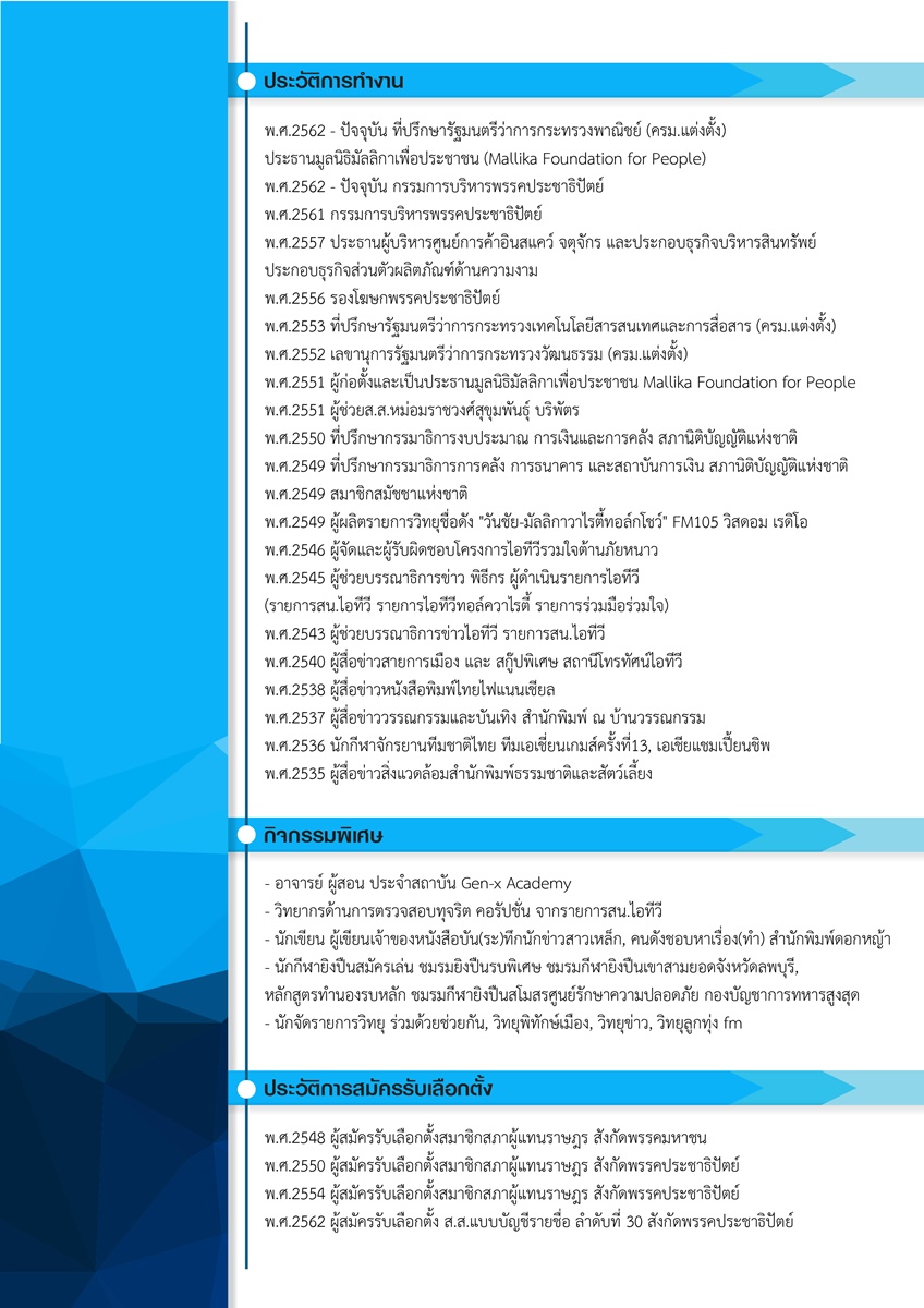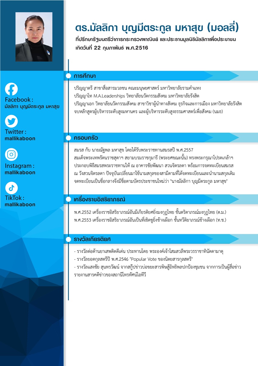ผู้สื่อข่าวรายงานว่า ที่น่าจับตามอง คือ นางมัลลิกา ที่ทำหน้าที่รับผิดชอบเป็นผู้ช่วยนายจุรินทร์ ลักษณวิศิษฏ์ หัวหน้าพรรคประชาธิปัตย์ รองนายกรัฐมนตรีและรัฐมนตรีว่าการกระทรวงพาณิชย์ ในตำแหน่งที่ปรึกษารัฐมนตรีว่าการกระทรวงพาณิชย์ มาตั้งแต่วันที่ 13 สิงหาคม 2562 จนถึงปัจจุบัน และสำเร็จการศึกษาปริญญาเอก สาขาวิชาผู้นำทางสังคม ธุรกิจ และการเมือง วิทยาลัยนวัตกรรมสังคม มหาวิทยาลัยรังสิต ผ่านหลักสูตรผู้บริหารระดับสูงมหานครและผู้บริหารระดับสูงธรรมศาสตร์เพื่อสังคม เคยเป็นทั้งที่ปรึกษารัฐมนตรีว่าการกระทรวงเทคโนโลยีสารสนเทศและการสื่อสาร เมื่อปี 2553 และเลขานุการรัฐมนตรีว่าการกระทรวงวัฒนธรรม เมื่อปี 2551 โดยที่ผ่านมาดำรงตำแหน่งผู้บริหารที่ระดับต้นของรัฐบาลมาโดยตลอด และเมื่อปี 2563 ผู้สื่อข่าวประจำกระทรวงพาณิชย์ ยกให้เป็นบุคคลสุดยอดแห่งปี ด้านได้ใจสื่อมวลชนกระทรวงพาณิชย์ที่สุด และปี 2564 ทีมมัลลิกาเป็นทีมที่ครองใจสื่อมวลชนพาณิชย์ที่สุด 2 ปีซ้อนเช่นกัน. – สำนักข่าวไทย