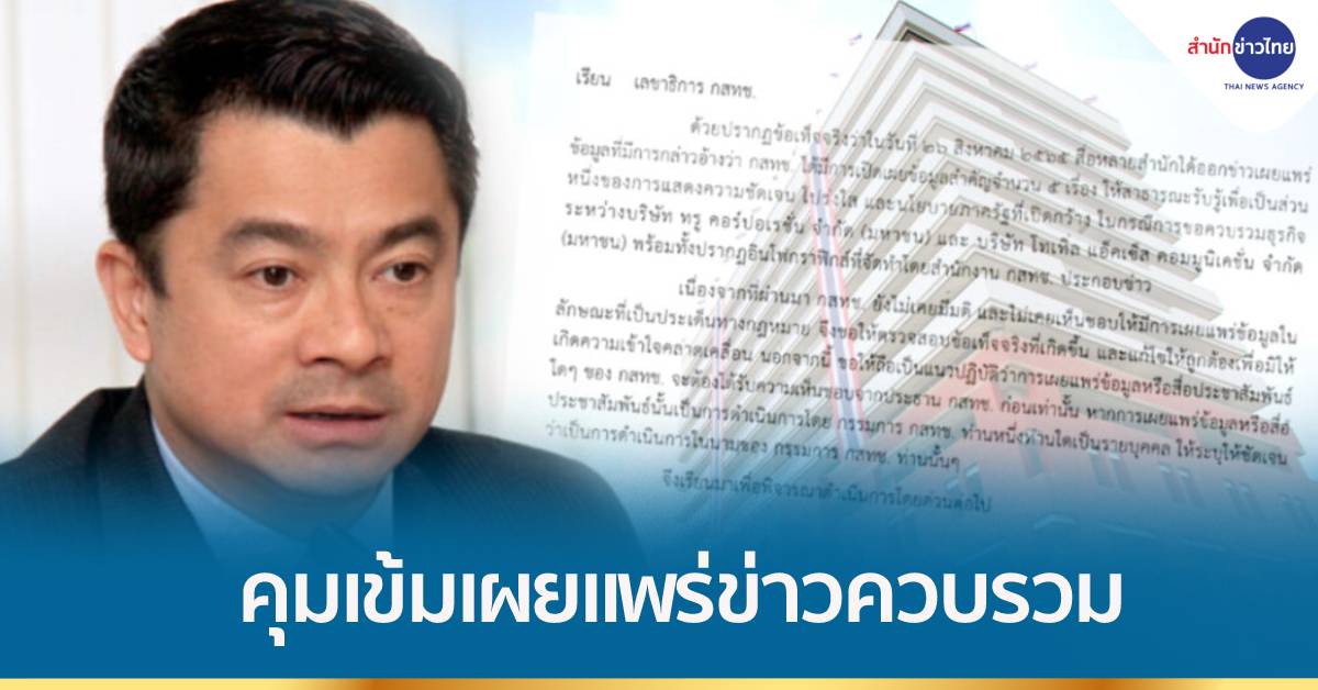 ทั้งนี้ เมื่อ 26 ส.ค.ที่ผ่านมา ประธาน กสทช. ได้ออกบันทึก โดยระบุว่า “ด้วยปรากฎข้อเท็จจริงว่าในวันที่ 26 สิงหาคม 2565 สื่อหลายสำนักได้ออกข่าวเผยแพร่ข้อมูลที่มีการกล่าวอ้างว่า กสทช. ได้มีการเปิดเผยข้อมูลสำคัญจำนวน 5 เรื่อง ให้สาธารณะรับรู้เพื่อเป็นส่วนหนึ่งของการแสดงความชัดเจน โปร่งใส และนโยบายภาครัฐที่เปิดกว้าง ในกรณีการขอควบรวมธุรกิจระหว่างบริษัท ทรู คอร์ปอเรชั่น จำกัด (มหาชน) และ บริษัท โทเทิ่ล แอ็คเซ็ส คอมมูนิเคชั่น จำกัด (มหาชน) พร้อมทั้งปรากฎอินโฟกราฟิกที่จัดทำโดยสำนักงาน กสทช. ประกอบข่าว