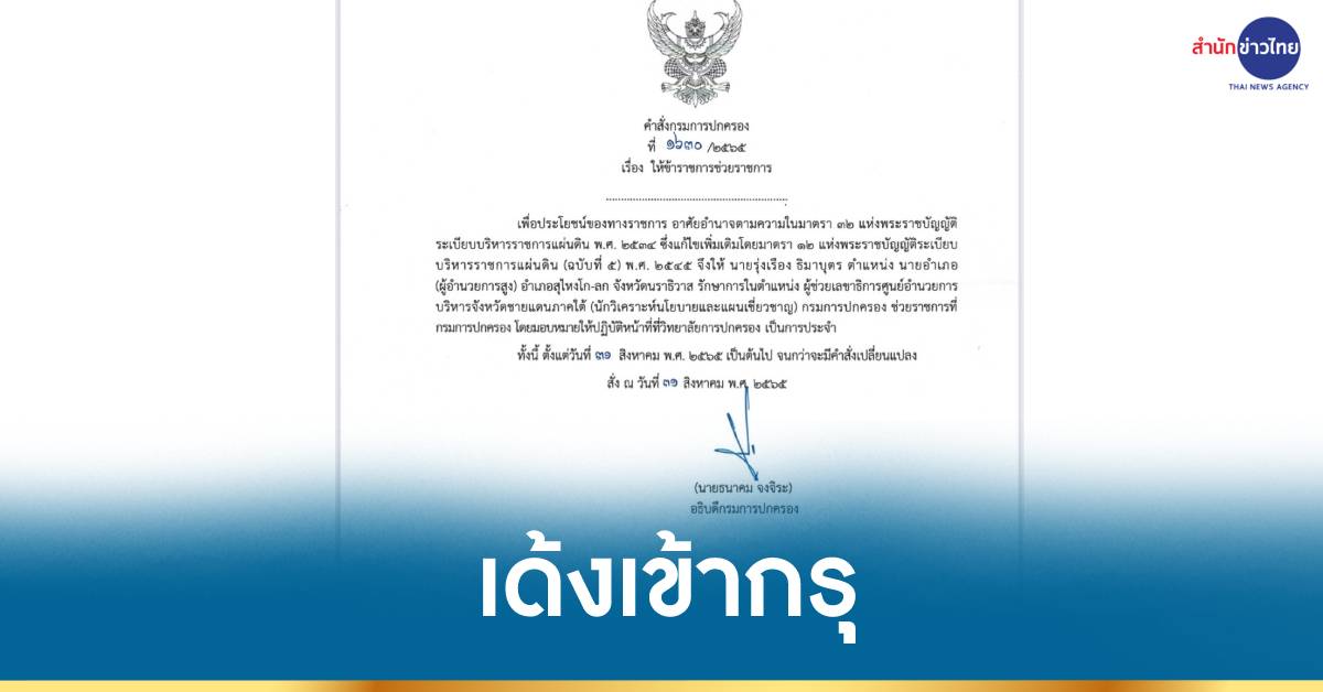 ก.มหาดไทย 31 ส.ค.-อธิบดีปกครอง เด้ง ‘รุ่งเรือง’ นายอำเภอสุไหงโก-ลก เข้ากรุ เซ่นปมพัวพันเว็บพนันออนไลน์