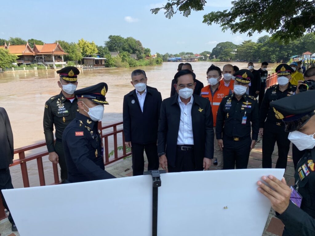 ต่อมา พล.อ.ประยุทธ์ ตรวจเยี่ยมจุดที่เจ้าหน้าที่ทหารกำลังเตรียมกระสอบทราย เพื่อทำพนังกั้นน้ำพร้อมกล่าวว่า เห็นสถานการณ์น้ำแล้วน่ากลัว ถ้าเทียบกับปีที่แล้ว น้ำมาเร็วกว่า เพราะปีที่แล้วน้ำมาในเดือนก.ย. และขณะนี้มีการปล่อยน้ำแล้ว 1,800 ลูกบาศก์เมตรต่อวินาที ขอให้ช่วยกันดูแลให้ดี
