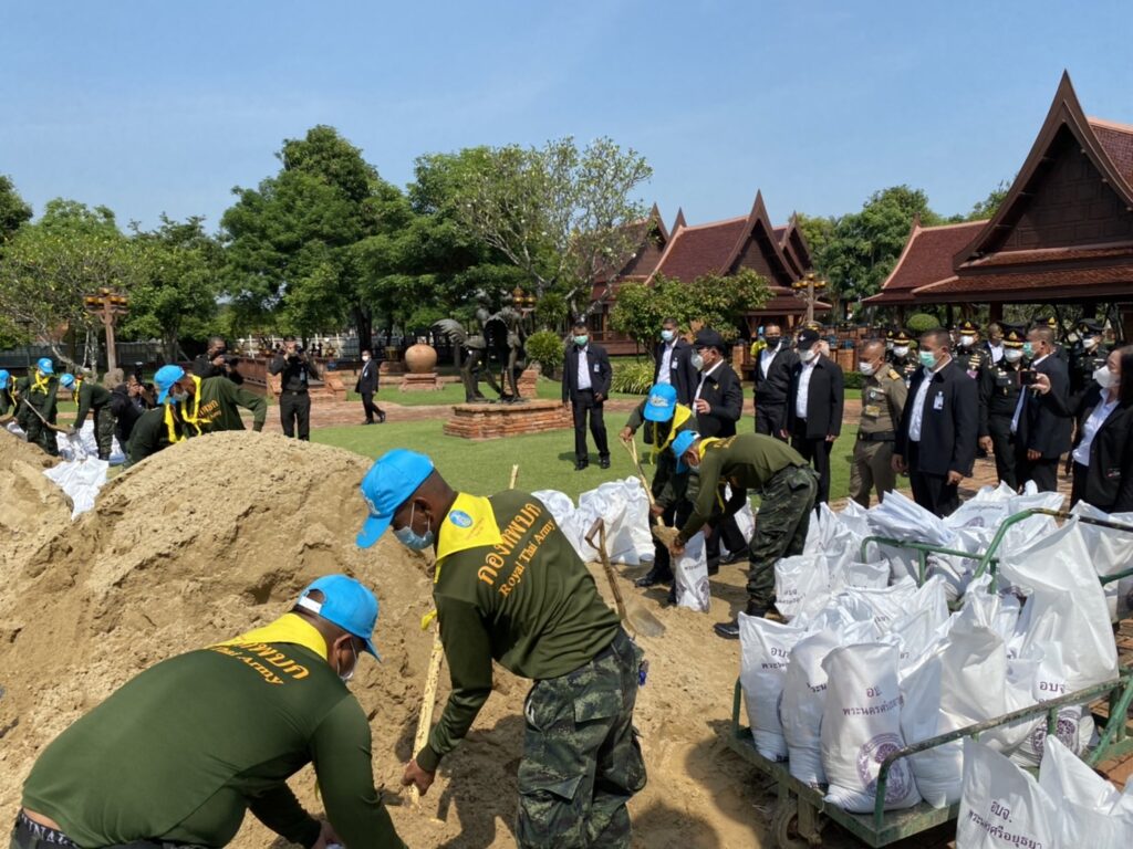 ผู้สื่อข่าวรายงานว่า พล.อ.ประยุทธ์ จันทร์โอชา รัฐมนตรีว่าการกระทรวงกลาโหม พร้อมด้วย พล.อ.ชัยชาญ ช้างมงคล รัฐมนตรีช่วยว่าการกระทรวงกลาโหม พล.อ.วรเกียรติ รัตนานนท์ ปลัดกระทรวงกลาโหม พล.อ.เจริญชัย หินเธาว์ ผู้ช่วยผู้บัญชาการทหารบก พล.ท.สุขสรรค์ หนองบัวล่าง แม่ทัพภาคที่ 1 เดินทางมายังวัดกษัตราธิราชวรวิหาร จ.พระนครศรีอยุธยา เพื่อติดตามการสร้างและซ่อมแซมพนังกั้นน้ำ พร้อมให้กำลังใจเจ้าหน้าที่ กองพันทหารม้าที่ 11 กรมทหารม้าที่ 4 รักษาพระองค์ รับผิดชอบ อำเภอพระนครศรีอยุธยา โดยเฉพาะพื้นที่สำคัญ ได้แก่วัดไชยวัฒนาราม วัดธรมาราม และวัดกษัตราธิราชวรวิหาร ที่ได้ติดตั้งพนังกั้นน้ำสแตนเลส ระยะ 490 เมตร ความสูง 2.2 เมตร บรรจุกระสอบทรายกว่า 11,800 กระสอบ ขณะเดียวกันพร้อมติดตั้งเครื่องสูบน้ำเพื่อทำงานทันทีเมื่อระดับน้ำสูงล้นพนังกั้นน้ำ ทั้งนี้หน่วยทหารได้เริ่มปฏิบัติงานในพื้นที่ 3 วัด ตั้งแต่วันที่ 16 สิงหาคม จนถึงสิ้นเดือนนี้