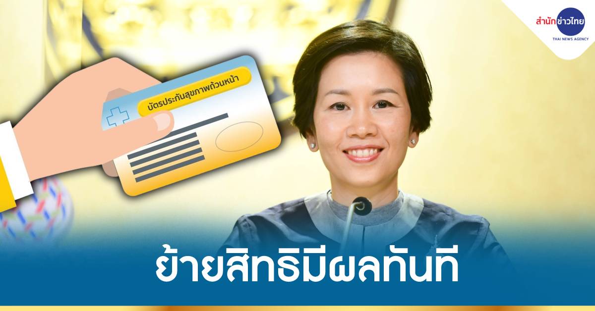 นางสาวรัชดา ธนาดิเรก รองโฆษกประจำสำนักนายกรัฐมนตรี เปิดเผยว่า ตามนโยบายยกระดับสิทธิบัตรทอง สำนักงานหลักประกันสุขภาพถ้วนหน้า (สปสช.) แจ้งผู้ถือบัตรทอง หรือ บัตรประกันสุขภาพถ้วนหน้าที่ต้องการย้ายโรงพยาบาลหรือหน่วยบริการในการรักษาพยาบาล สามารถย้ายสิทธิบัตรทองได้ด้วยตัวเอง หรือมอบอำนาจให้ดำเนินการแทน สำหรับสิทธิบัตรทอง หรือ สิทธิหลักประกันสุขภาพแห่งชาติ สามารถปลี่ยนหน่วยบริการได้มากกว่า 1 ครั้ง แต่จะไม่เกิน 4 ครั้งต่อปี เพื่ออำนวยความสะดวกให้กับประชาชน รวมถึงสอดคล้องกับบริบทของสังคมไทยในปัจจุบันที่มีการเคลื่อนย้ายไปยังที่ต่างๆ บ่อยขึ้น เช่น คนทำงาน นักเรียน นักศึกษา เป็นต้น