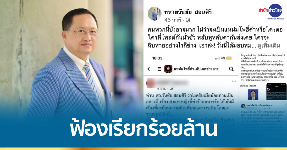 กทม. 4 ก.ย. – “ส.ว.วันชัย” เดือดจัด มอบหมายทนายความดำเนินคดีหมิ่นประมาท ทั้งอาญาและแพ่ง เรียกค่าเสียหายร้อยล้าน คนโพสต์พาดพิงปม “ส.ต.ท.หญิง” เป็นเมียน้อย ซึ่งไม่เป็นความจริงใดๆ ทั้งสิ้น ลั่นเอาให้เข็ด