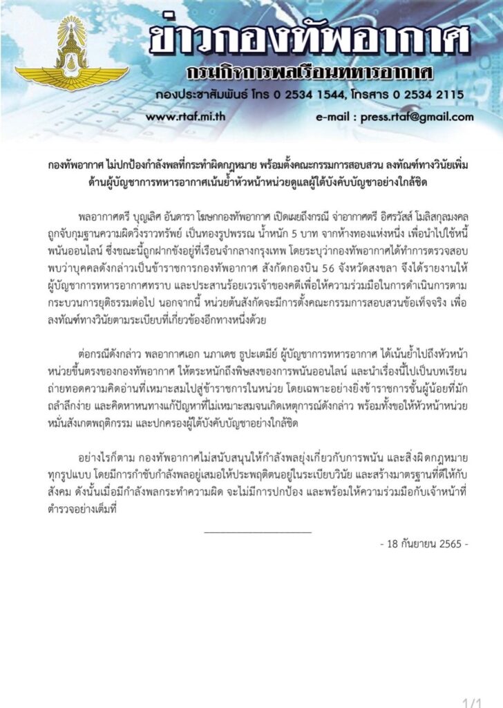 พลอากาศตรีบุญเลิศ อันดารา โฆษกกองทัพอากาศ เปิดเผยถึงกรณี จ่าอากาศตรีนายหนึ่งถูกจับกุมฐานความผิดวิ่งราวทรัพย์ เป็นทองรูปพรรณน้ำหนัก 5 บาทจากห้างทองแห่งหนึ่ง เพื่อนำไปใช้หนี้พนันออนไลน์ ซึ่งขณะนี้ถูกฝากขังอยู่ที่เรือนจำกลางกรุงเทพ ระบุว่ากองทัพอากาศได้ตรวจสอบพบว่าบุคคลดังกล่าวเป็นข้าราชการกองทัพอากาศ สังกัดกองบิน 56 จังหวัดสงขลา