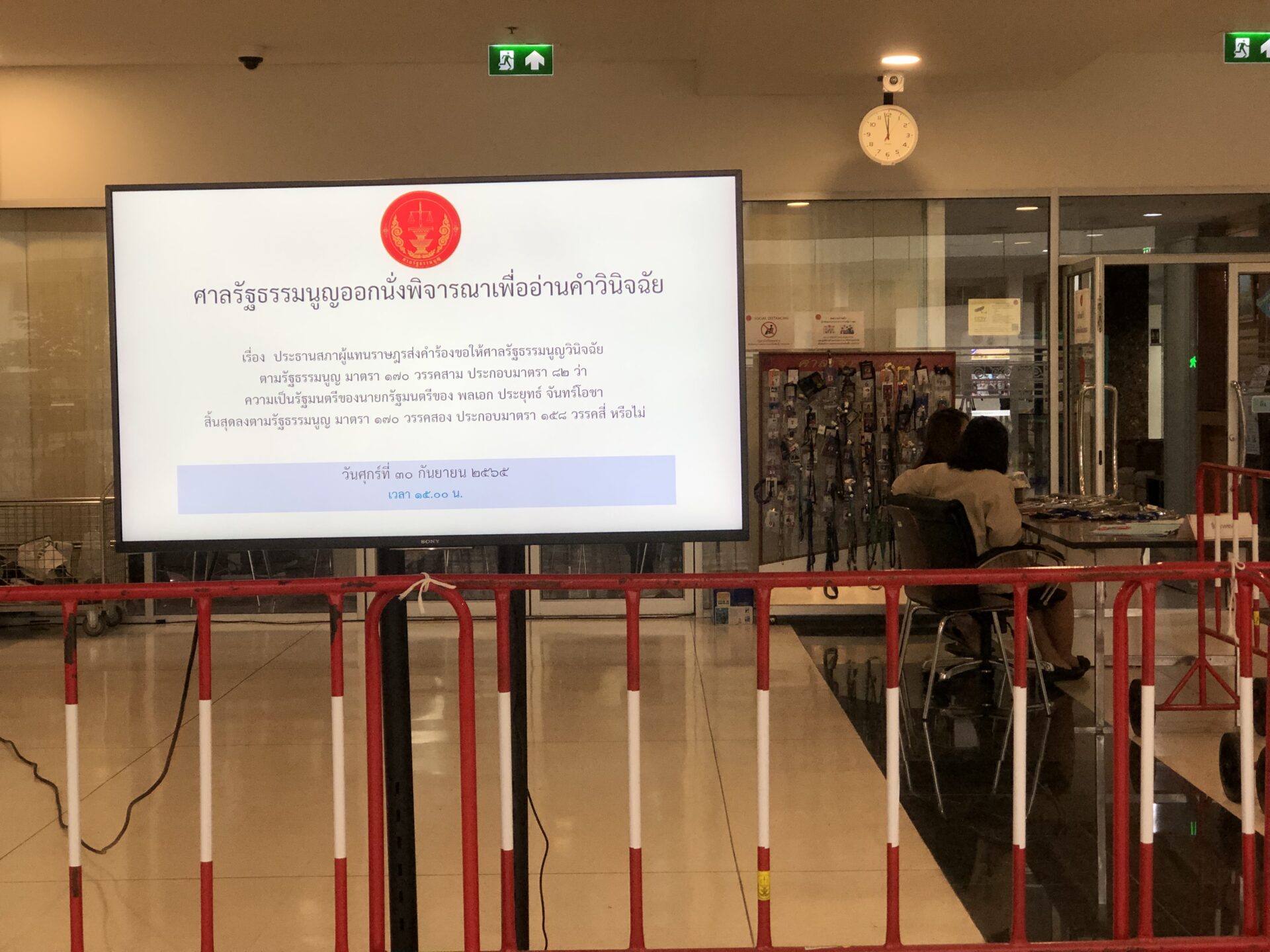 ผู้สื่อข่าวรายงานว่า องค์คณะตุลาการศาลรัฐธรรมนูญจะออกนั่งบัลลังค์อ่านคำวินิจฉัยในคดีที่นายชวน หลีกภัย ประธานสภาผู้แทนราษฎรส่งคำร้องของ ส.ส.ฝ่ายค้าน 171 คน เข้าชื่อขอให้วินิจฉัยวาระการดำรงตำแหน่งนายกรัฐมนตรี 8 ปี ของพล.อ.ประยุทธ์ จันทร์โอชา นายกรัฐมนตรี ซึ่งช่วงเช้าที่ผ่านมา ตุลาการศาลรัฐธรรมนูญได้ประชุมเพื่อปรึกษาหารือคดและแถลงด้วยวาจาของตุลาการแต่ละคนก่อนจะลงมติและจัดทำคำวินิจฉัยส่วนกลาง จากนั้น ในเวลา 15.00 น.จะออกนั่งบัลลังค์อ่านคำวินิจฉัยให้กับคู่กรณีได้รับฟัง อย่างไรก็ตาม วันนี้พล.อ.ประยุทธ์ไม่ได้มารับฟังด้วยตัวเอง โดยมอบหมายให้พล.ต.ตรีวิระ โรจนวาศ ที่ปรึกษานายกรัฐมนตรีเป็นผู้แทนมารับฟังคำวินิจฉัย ขณะที่ผู้ร้อง เป็นฝ่ายกฎหมายของสำนักงานเลขาธิการสภาผู้แทนราษฎรเป็นตัวแทนรับฟังคำวินิจฉัย