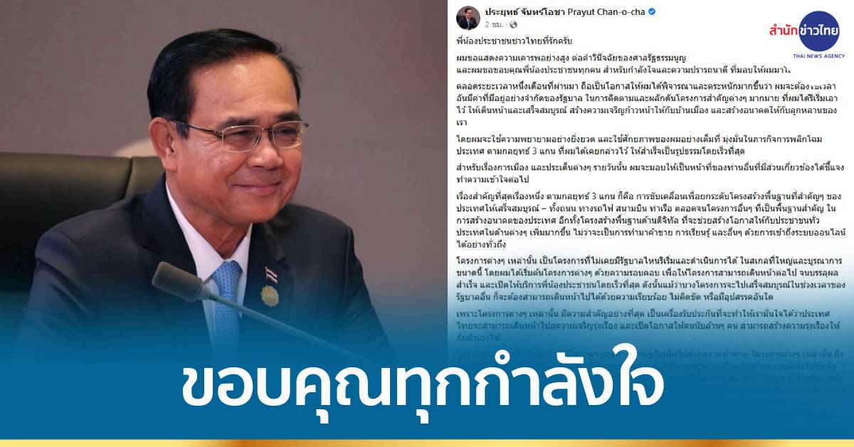 ผู้สื่อข่าวรายงานว่า ภายหลังศาลรัฐธรรมนูญอ่านคำวินิจฉัยว่าความเป็นนายกรัฐมนตรีของ พล.อ.ประยุทธ์ จันทร์โอชา ยังไม่สิ้นสุดลง และยังไม่ครบกำหนดระยะเวลา 8 ปี พล.อ.ประยุทธ์ จันทร์โอชา นายกรัฐมนตรี โพสต์ข้อความผ่านเฟซบุ๊ก ประยุทธ์ จันทร์โอชา Prayut Chan-o-cha ข้อความว่า ผมขอแสดงความเคารพอย่างสูง ต่อคำวินิจฉัยของศาลรัฐธรรมนูญ และผมขอขอบคุณพี่น้องประชาชนทุกคน สำหรับกำลังใจและความปรารถนาดี ที่มอบให้ผมมาโดยตลอด