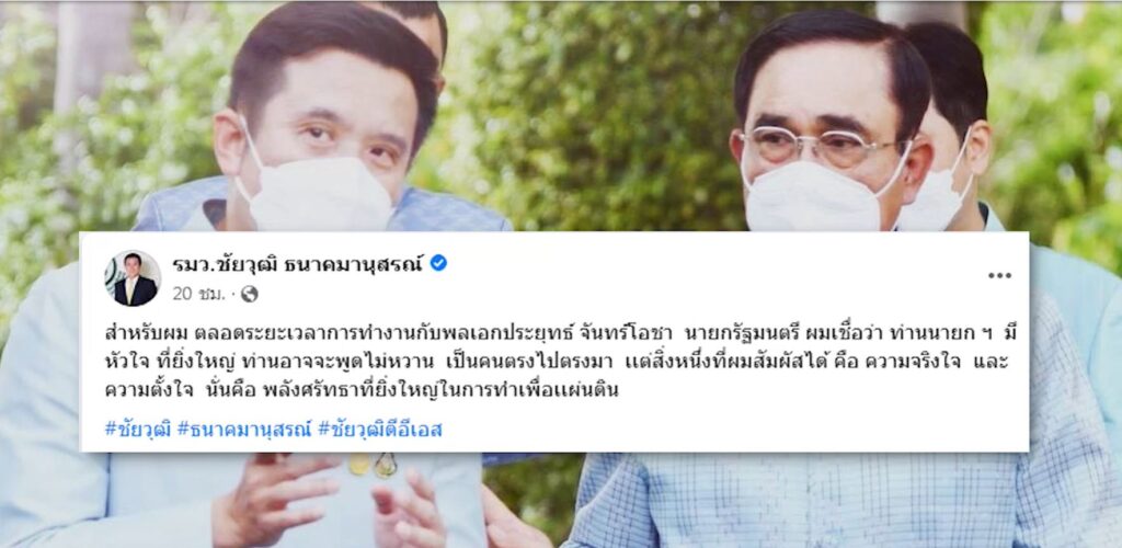 ส่วนความเคลื่อนไหวของนายชัยวุฒิฯเกี่ยวกับ พลงอ.ประยุทธ์ ก็ได้โพสต์ Facebook ส่วนตัวบอกว่า “สำหรับผม ตลอดระยะเวลาการทำงานกับพลเอกประยุทธ์ จันทร์โอชา นายกรัฐมนตรี ผมเชื่อว่าท่านนายกฯ มีหัวใจที่ยิ่งใหญ่ ท่านอาจพูดไม่หวาน เป็นคนตรงไปตรงมา เเต่สิ่งหนึ่งที่ผมสัมผัสได้ คือ ความจริงใจและความตั้งใจ นั่นคือ พลังศรัทธาที่ยิ่งใหญ่ในการทำเพื่อเเผ่นดิน” . – สำนักข่าวไทย