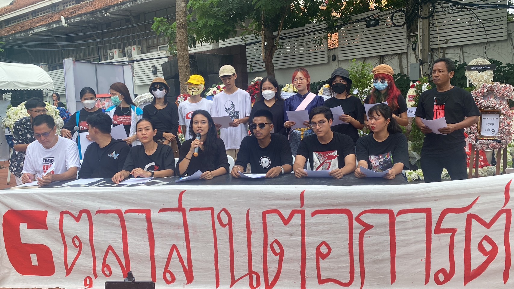 มธ. ท่าพระจันทร์ 6 ต.ค. -กล่มราษฎรสานต่อการต่อสู้ 6 ตุลา จี้รัฐบาลยุบสภา ศาลวินิจฉัยกม.ลูกให้ชัด กกต.ประกาศแบ่งเขต-กติกานักการเมืองทำได้-ไม่ได้ เร่งจัดเลือกตั้ง จี้ ปชช.ต้องเลือกส.ส.ฝ่ายประชาธิปไตย