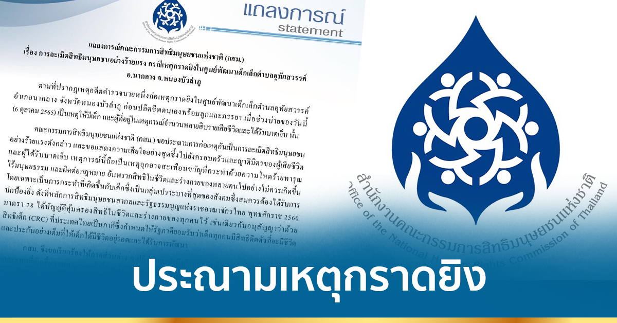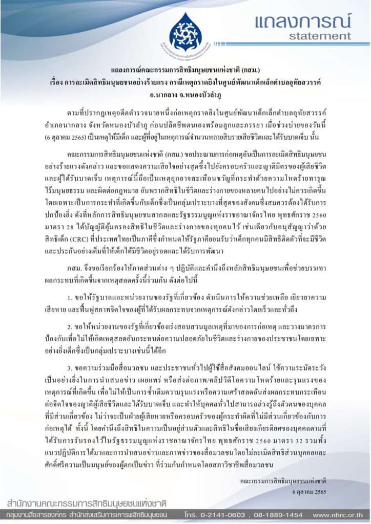 กสม. วันนี้ (6 ต.ค.) คณะกรรมการสิทธิมนุษยชนแห่งชาติ (กสม.) ออกแถลงการณ์กรณีเหตุกราดยิงในศูนย์พัฒนาเด็กเล็กตำบลอุทัยสวรรค์ อ.นากลาง จ.หนองบัวลำภู เป็นเหตุให้มีเด็ก และผู้ที่อยู่ในเหตุการณ์จำนวนหลายรายเสียชีวิตและได้รับบาดเจ็บ ว่า กสม. ขอประณามการก่อเหตุอันเป็นการละเมิดสิทธิมนุษยชนอย่างร้ายแรงดังกล่าว และขอแสดงความเสียใจอย่างสุดซึ้งไปยังครอบครัวและญาติมิตรของผู้เสียชีวิตและผู้ได้รับบาดเจ็บ เหตุการณ์นี้ถือเป็นเหตุอุกอาจสะเทือนขวัญที่กระทำด้วยความโหดร้ายทารุณ ไร้มนุษยธรรม และผิดต่อกฎหมาย อันพรากสิทธิในชีวิตและร่างกายของหลายคนไปอย่างไม่ควรเกิดขึ้น โดยเฉพาะเป็นการกระทำที่เกิดขึ้นกับเด็กซึ่งเป็นกลุ่มเปราะบางที่สุดของสังคมซึ่งสมควรต้องได้รับการปกป้องยิ่ง ดังที่หลักการสิทธิมนุษยชนสากลและรัฐธรรมนูญ 2560 มาตรา 28 ได้บัญญัติคุ้มครองสิทธิในชีวิตและร่างกายของทุกคนไว้ เช่นเดียวกับอนุสัญญาว่าด้วยสิทธิเด็ก (CRC) ที่ประเทศไทยเป็นภาคีซึ่งกำหนดให้รัฐภาคียอมรับว่าเด็กทุกคนมีสิทธิติดตัวที่จะมีชีวิต และประกันอย่างเต็มที่ให้เด็กได้มีชีวิตอยู่รอดและได้รับการพัฒนา