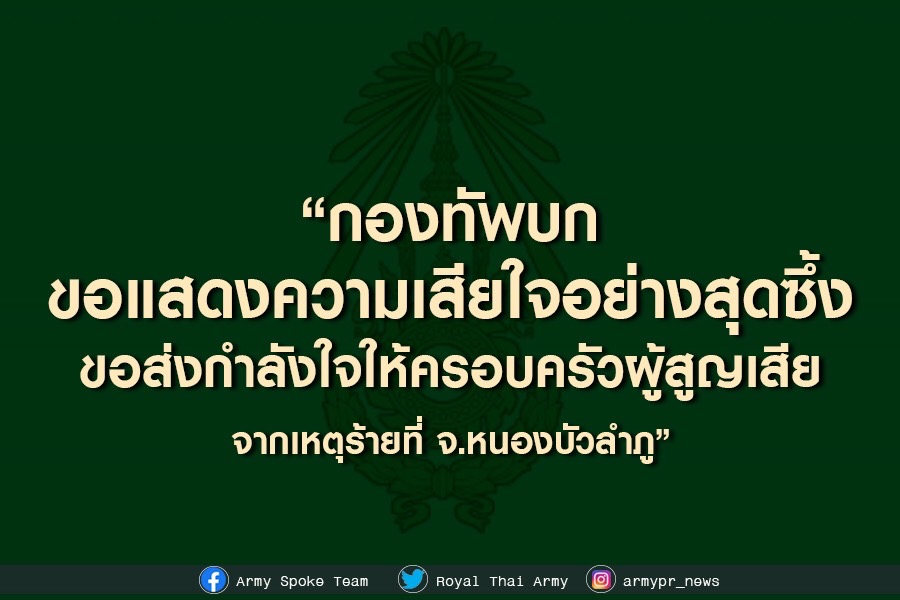 พล.ต.หญิงศิริจันทร์ งาทอง รองโฆษกกองทัพบก เปิดเผยว่า จากเหตุการณ์ร้ายแรงที่เกิดขึ้นที่ศูนย์พัฒนาเด็กเล็กในพื้นที่ จ.หนองบัวลําภู จนเป็นเหตุให้มีผู้เสียชีวิตและบาดเจ็บจํานวนมาก กองทัพบกขอแสดงความเสียใจอย่างสุดซึ้งต่อครอบครัวของผู้เสียชีวิตที่ต้องสูญเสียบุคคลอันเป็นที่รัก รวมทั้งผู้ที่ได้รับบาดเจ็บในครั้งนี้ ทั้งนี้ พล.อ.ณรงค์พันธ์ จิตต์แก้วแท้ ผู้บัญชาการทหารบกรับทราบเหตุการณ์ด้วยความเป็นห่วง และสั่งการให้หน่วยทหารในพื้นที่ดูแลช่วยเหลือ สนับสนุนการคลี่คลายเหตุการณ์ของเจ้าหน้าที่ที่เกี่ยวข้องอย่างเต็มที่ ทั้งการจัดทีมแพทย์ พยาบาลประสานการทำงานกับรพ.หนองบัวลำภู เพื่อร่วมรักษาผู้บาดเจ็บ