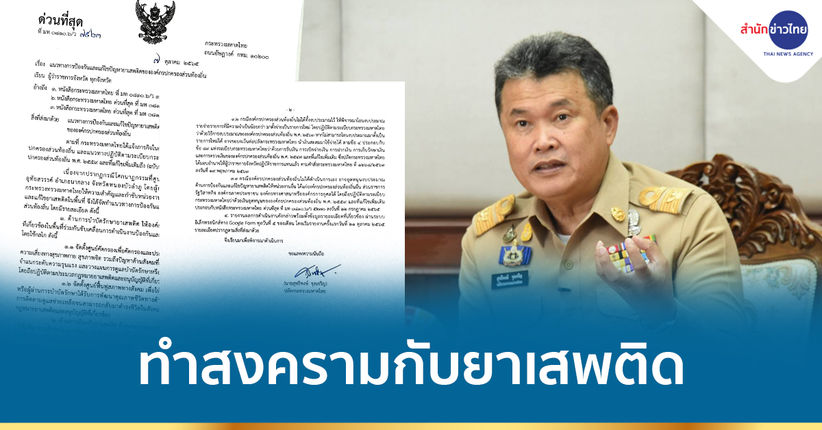 กทม. 9 ต.ค.- ปลัดมหาดไทยเเจ้งเเนวทางป้องกันและเเก้ไขปัญหายาเสพติดของ อปท.ให้ทุกจังหวัดด่วน พร้อมขอให้ทุกฝ่ายร่วมเป็นพันธมิตรทำสงครามกับยาเสพติด