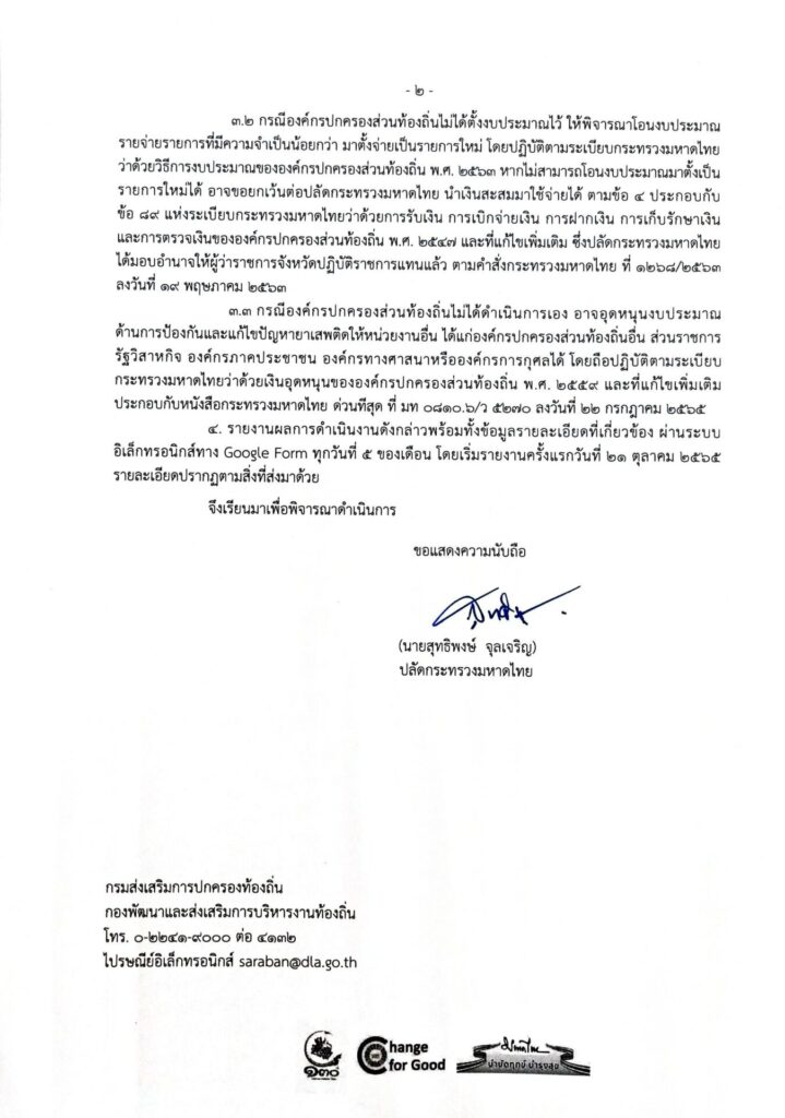 นายสุทธิพงษ์ จุลเจริญ ปลัดกระทรวงมหาดไทย กล่าวต่อว่า ด้านที่ 2 คือ การป้องกันยาเสพติด ด้วยกระบวนการมีส่วนร่วมของหมู่บ้าน/ชุมชน ในการสร้างภูมิคุ้มกัน การเฝ้าระวัง การค้นหา การรักษา การให้โอกาส การดูแลและช่วยเหลือผู้ที่เกี่ยวข้องกับยาเสพติดรวมทั้งเสริมสร้างความเข้มแข็งและพัฒนาคุณภาพชีวิตของประชาชน และด้านที่ 3 งบประมาณ เพื่อดำเนินการป้องกันและแก้ไขปัญหายาเสพติด โดยมี 3 แนวทาง ได้แก่ 1. ให้องค์กรปกครองส่วนท้องถิ่นตั้งงบประมาณในเทศบัญญัติ/ข้อบัญญัติ ตามนโยบายของรัฐบาลและกระทรวงมหาดไทย ด้านการป้องกันและแก้ไขปัญหายาเสพติด 2. กรณีองค์กรปกครองส่วนท้องถิ่นไม่ได้ตั้งงบประมาณไว้ ให้พิจารณาโอนงบประมาณรายจ่ายรายการที่มีความจำเป็นน้อยกว่า มาตั้งจ่ายเป็นรายการใหม่ โดยปฏิบัติตามระเบียบกระทรวงมหาดไทยว่าด้วยวิธีการงบประมาณขององค์กรปกครองส่วนท้องถิ่น พ.ศ. 2563 หากไม่สามารถโอนงบประมาณมาตั้งเป็นรายการใหม่ได้ อาจขอยกเว้นต่อปลัดกระทรวงมหาดไทย นำเงินสะสมมาใช้จ่ายได้ ตามข้อ 4 ประกอบกับ ข้อ 89 แห่งระเบียบกระทรวงมหาดไทยว่าด้วยการรับเงิน การเบิกจ่ายเงิน การฝากเงิน การเก็บรักษาเงิน และการตรวจเงินขององค์กรปกครองส่วนท้องถิ่น พ.ศ. 2559 และที่แก้ไขเพิ่มเติม ซึ่งปลัดกระทรวงมหาดไทย ได้มอบอำนาจให้ผู้ว่าราชการจังหวัดปฏิบัติราชการแทนแล้ว ตามคำสั่งกระทรวงมหาดไทย ที่ 1268/2563 ลงวันที่ 19 พ.ค. 2563 และ 3. กรณีองค์กรปกครองส่วนท้องถิ่นไม่ได้ดำเนินการเอง อาจอุดหนุนงบประมาณด้านการป้องกันและแก้ไขปัญหายาเสพติดให้หน่วยงานอื่น ได้แก่องค์กรปกครองส่วนท้องถิ่นอื่น ส่วนราชการ รัฐวิสาหกิจ องค์กรภาคประชาชน องค์กรทางศาสนา หรือองค์กรการกุศลได้ โดยถือปฏิบัติตามระเบียบกระทรวงมหาดไทยว่าด้วยเงินอุดหนุนขององค์กรปกครองส่วนท้องถิ่น พ.ศ. 2559 และที่แก้ไขเพิ่มเติม ประกอบกับหนังสือกระทรวงมหาดไทย ด่วนที่สุด ที่ มท 0810.6/ว 5270 ลงวันที่ 22 ก.ค. 2565 ทั้งนี้ ได้สั่งการให้ทุกจังหวัดรายงานผลการดำเนินงานพร้อมทั้งข้อมูลรายละเอียดที่เกี่ยวข้อง ผ่านระบบอิเล็กทรอนิกส์ ทุกวันที่ 5 ของเดือน โดยเริ่มรายงานครั้งแรกวันที่ 21 ต.ค. 2565