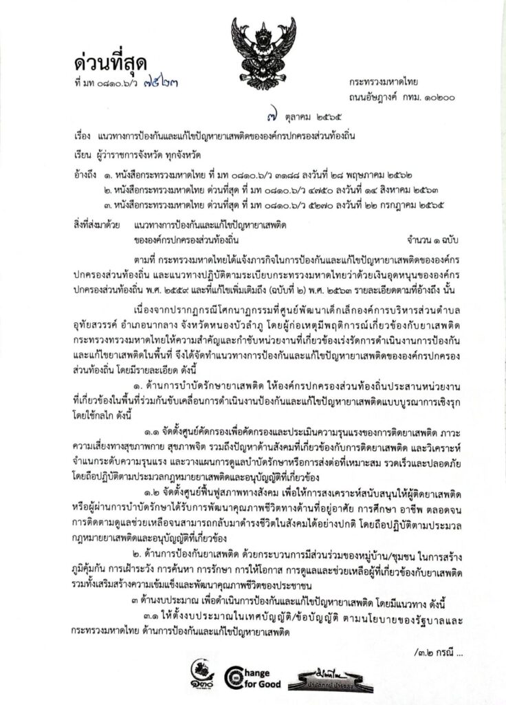 นายสุทธิพงษ์ จุลเจริญ ปลัดกระทรวงมหาดไทย เปิดเผยว่า กระทรวงมหาดไทย โดยกรมส่งเสริมการปกครองท้องถิ่น (กองพัฒนาและส่งเสริมการบริหารงานท้องถิ่น) ได้เเจ้งแนวทางการป้องกันและเเก้ไขปัญหายาเสพติดขององค์กรปกครองส่วนท้องถิ่น และแนวทางปฏิบัติตามระเบียบกระทรวงมหาดไทยว่าด้วยเงินอุดหนุนขององค์กรปกครองส่วนท้องถิ่น พ.ศ. 2559 และที่แก้ไขเพิ่มเติม (ฉบับที่ 2) พ.ศ. 2563ให้ทุกจังหวัดแล้ว เมื่อวันที่ 7 ต.ค. 65 สืบเนื่องจากกรณีโศกนาฎกรรมที่ศูนย์พัฒนาเด็กเล็กองค์การบริหารส่วนตำบล อุทัยสวรรค์ อำเภอนากลาง จังหวัดหนองบัวลำภู โดยผู้ก่อเหตุมีพฤติการณ์เกี่ยวข้องกับยาเสพติด กระทรวงมหาดไทยให้ความสำคัญและกำชับหน่วยงานที่เกี่ยวข้องเร่งรัดการดำเนินงานการป้องกัน และแก้ไขยาเสพติดในพื้นที่ จึงได้จัดทำแนวทางการป้องกันและแก้ไขปัญหายาเสพติดขององค์กรปกครองส่วนท้องถิ่นใน 3 ด้าน ประกอบด้วย ด้านที่ 1 การบำบัดรักษายาเสพติด ให้องค์กรปกครองส่วนท้องถิ่นประสานหน่วยงานที่เกี่ยวข้องในพื้นที่ร่วมกันขับเคลื่อนการดำเนินงานป้องกันและแก้ไขปัญหายาเสพติดแบบบูรณาการเชิงรุก โดยจัดตั้งศูนย์คัดกรองเพื่อคัดกรองและประเมินความรุนแรงของการติดยาเสพติด ภาวะความเสี่ยงทางสุขภาพกาย สุขภาพจิต รวมถึงปัญหาด้านสังคมที่เกี่ยวข้องกับการติดยาเสพติด และวิเคราะห์จำแนกระดับความรุนแรง และวางแผนการดูแลบำบัดรักษาหรือการส่งต่อที่เหมาะสม รวดเร็วและปลอดภัย และจัดตั้งศูนย์ฟื้นฟูสภาพทางสังคม เพื่อให้การสงเคราะห์สนับสนุนให้ผู้ติดยาเสพติด หรือ ผู้ผ่านการบำบัดรักษาได้รับการพัฒนาคุณภาพชีวิตทางด้านที่อยู่อาศัย การศึกษา อาชีพ ตลอดจน การติดตามดูแลช่วยเหลือจนสามารถกลับมาดำรงชีวิตในสังคมได้อย่างปกติ โดยถือปฏิบัติตามประมวลกฎหมายยาเสพติดและอนุบัญญัติที่เกี่ยวข้อง