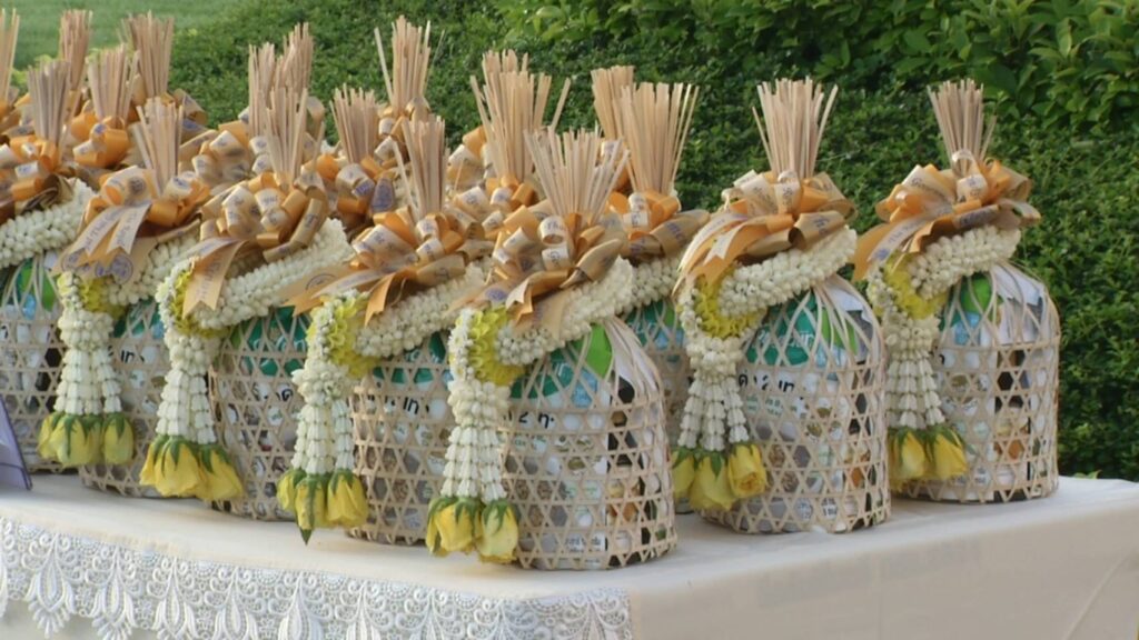 ต่อจากนั้น นายกรัฐมนตรีและภริยา นำผู้ร่วมงานใส่บาตรพระสงฆ์ ณ บริเวณด้านหน้าตึกไทยคู่ฟ้าและตึกสันติไมตรี เป็นอันเสร็จพิธี